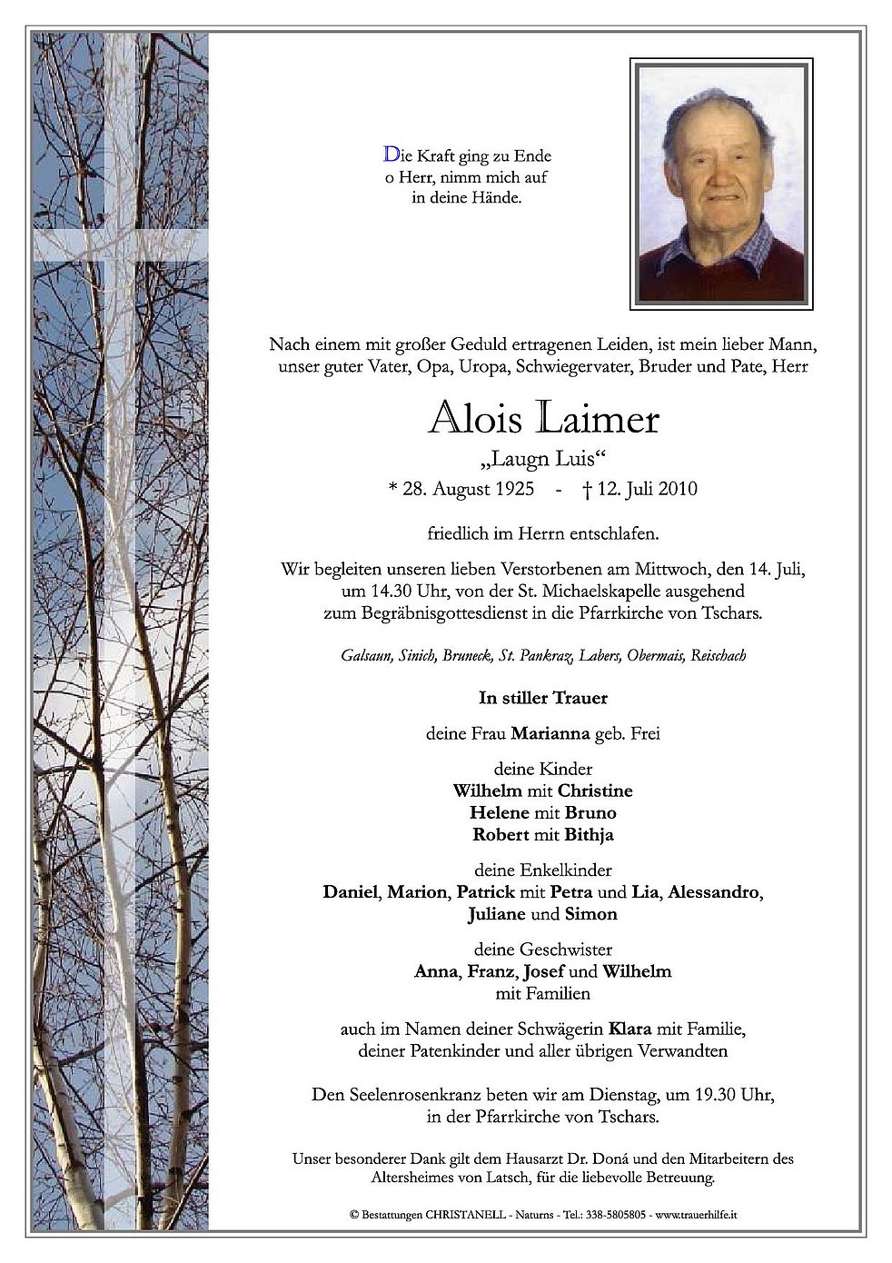 Unser besonderer Dank gilt dem Hausarzt Dr. Doná und den Mitarbeitern des Altersheimes von Latsch für die liebevolle Betreuung.