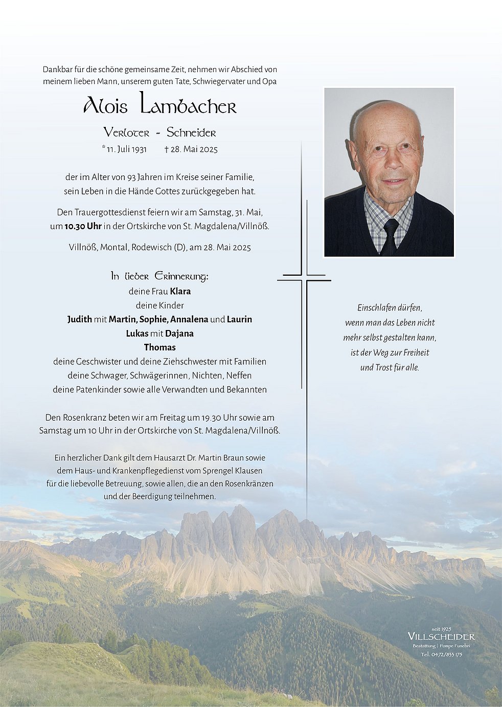 Begräbnisgottesdienst: 31.05. - 10:30 Uhr St. Magdalena/Villnöß