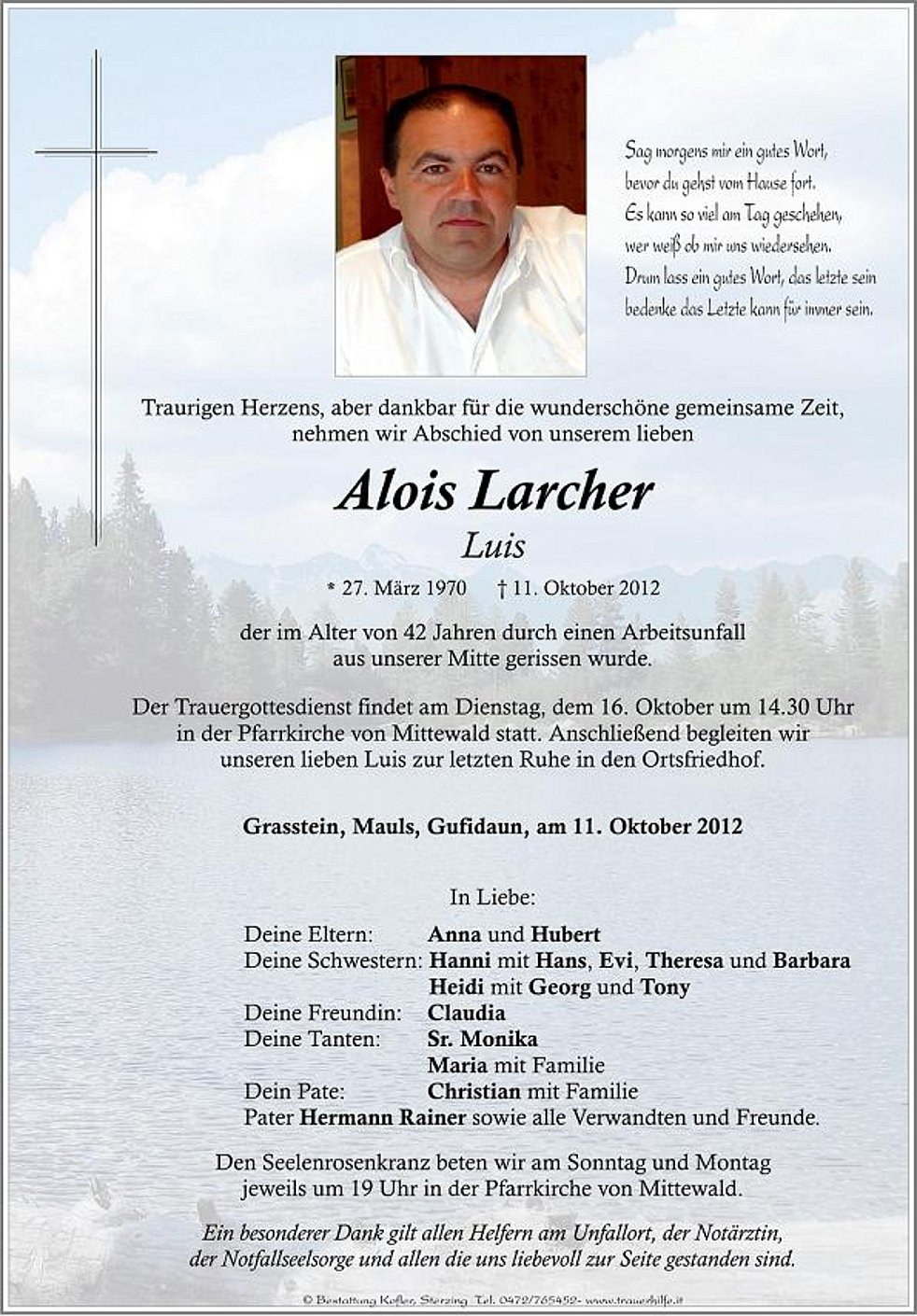 Eine lange und alte Freundin aus Kärnten die es erst jetzt erfuhr das es den Alois nicht mehr gibt ist sehr traurig über diese unfassbare schreckliche Nachricht und ich wünsche den Eltern und den Schwestern mit Verwandten viel,viel Kraft und mein herzliches Beileid. Patricia L.