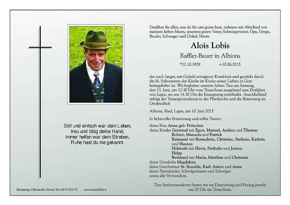 den 13. Juni, um 12.30 Uhr vom Trauerhaus ausgehend zum Dorfplatz von Lajen, wo um 14.30 Uhr die Einsegnung stattfindet. Anschließend erfolgt der Trauergottesdienst in der Pfarrkirche und die Beisetzung im Ortsfriedhof.