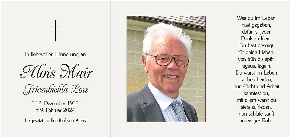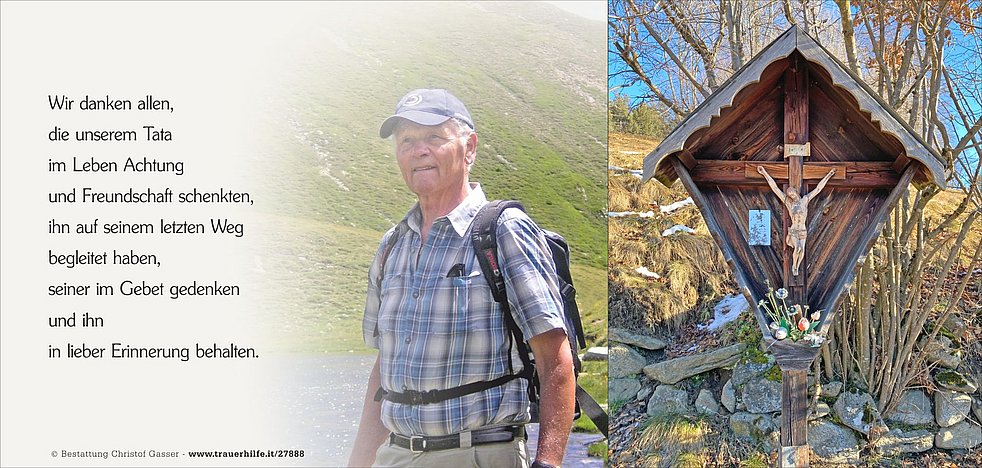 Unser lieber Tata ist ab Samstagmittag bis Montagmittag zur persönlichen Verabschiedung in der Friedhofskapelle von Kiens aufgebahrt.