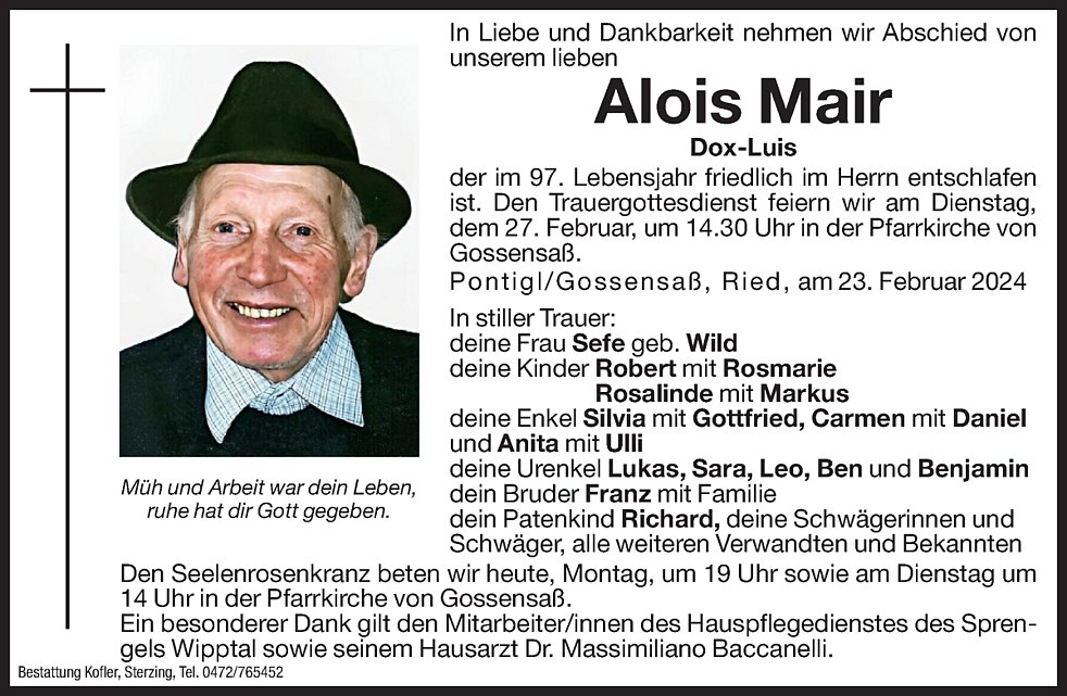Ein besonderer Dank gilt den Mitarbeiter/innen des Hauspflegedienstes des Sprengels Wipptal sowie seinem Hausarzt Dr. Massimiliano Baccanelli.
