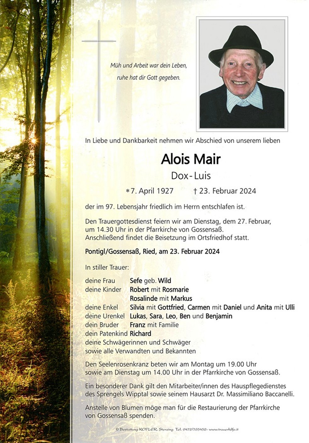 Anstelle von Blumen möge man für die Restaurierung der Pfarrkirche von Gossensaß spenden.