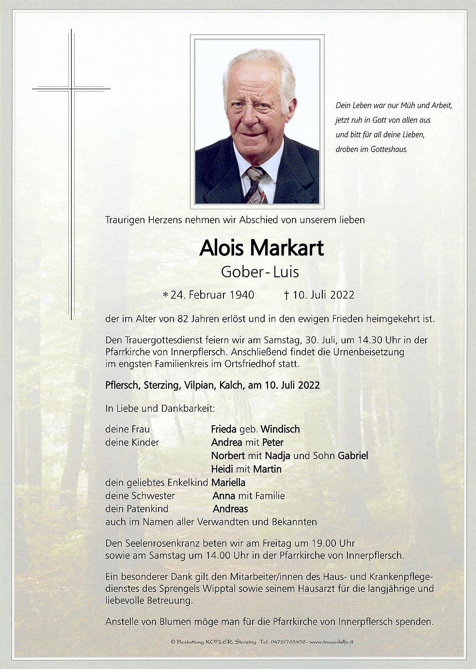 Anstelle von Blumen möge man für die Pfarrkirche von Innerpflersch spenden.