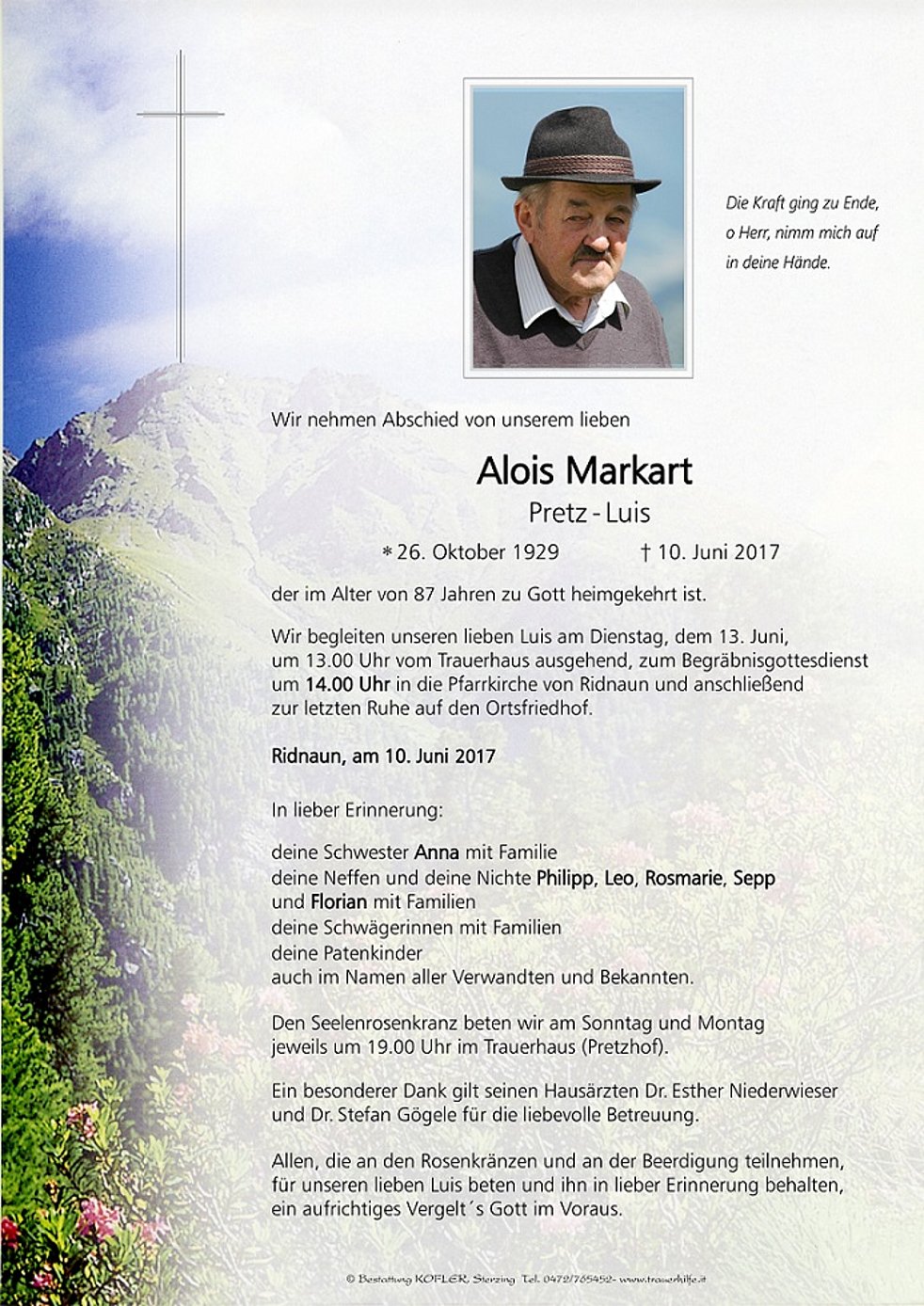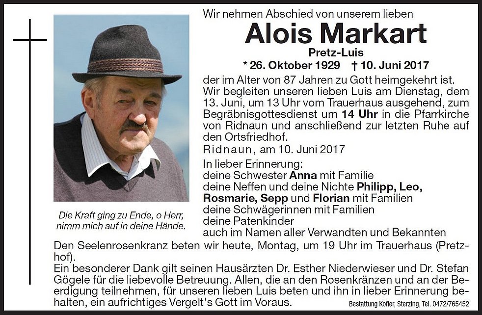 Wir begleiten unseren lieben Luis am Dienstag, dem 13. Juni, um 13.00 Uhr vom Trauerhaus ausgehend, zum Begräbnisgottesdienst um 14.00 Uhr in die Pfarrkirche von Ridnaun und anschließend zur letzten Ruhe auf den Ortsfriedhof.