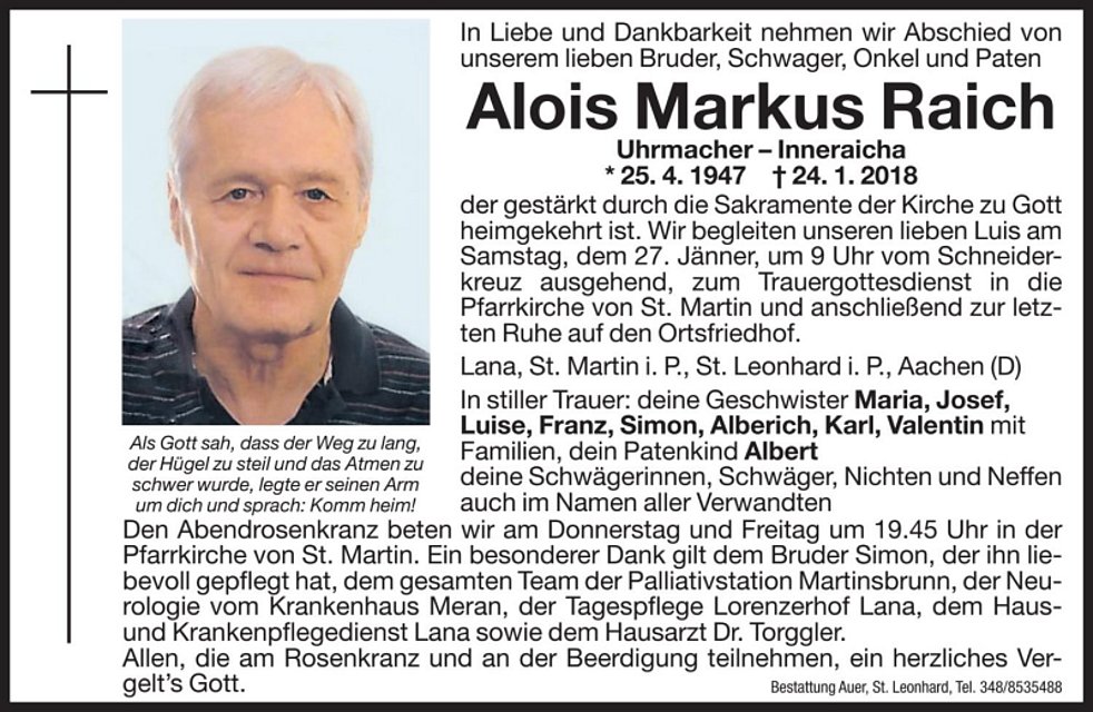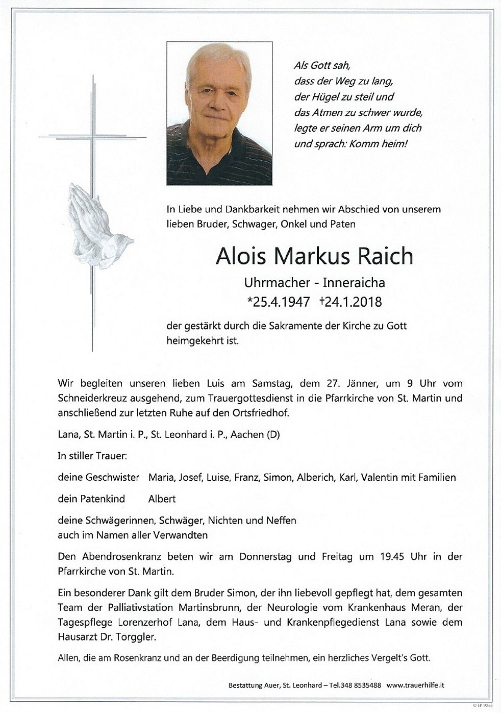 Ein besonderer Dank gilt dem Bruder Simon, der ihn liebevoll gepflegt hat, dem gesamten Team der Palliativstation Martinsbrunn, der Neurologie vom Krankenhaus Meran, der Tagespflege Lorenzerhof Lana, dem Haus- und Krankenpflegedienst Lana sowie dem Hausarzt Dr. Torggler.