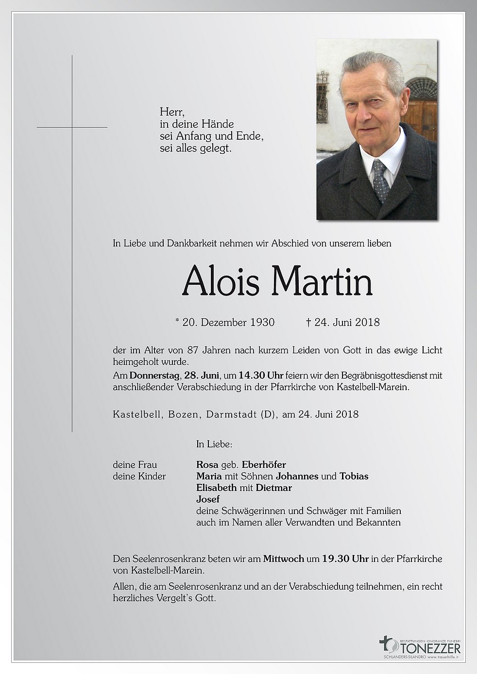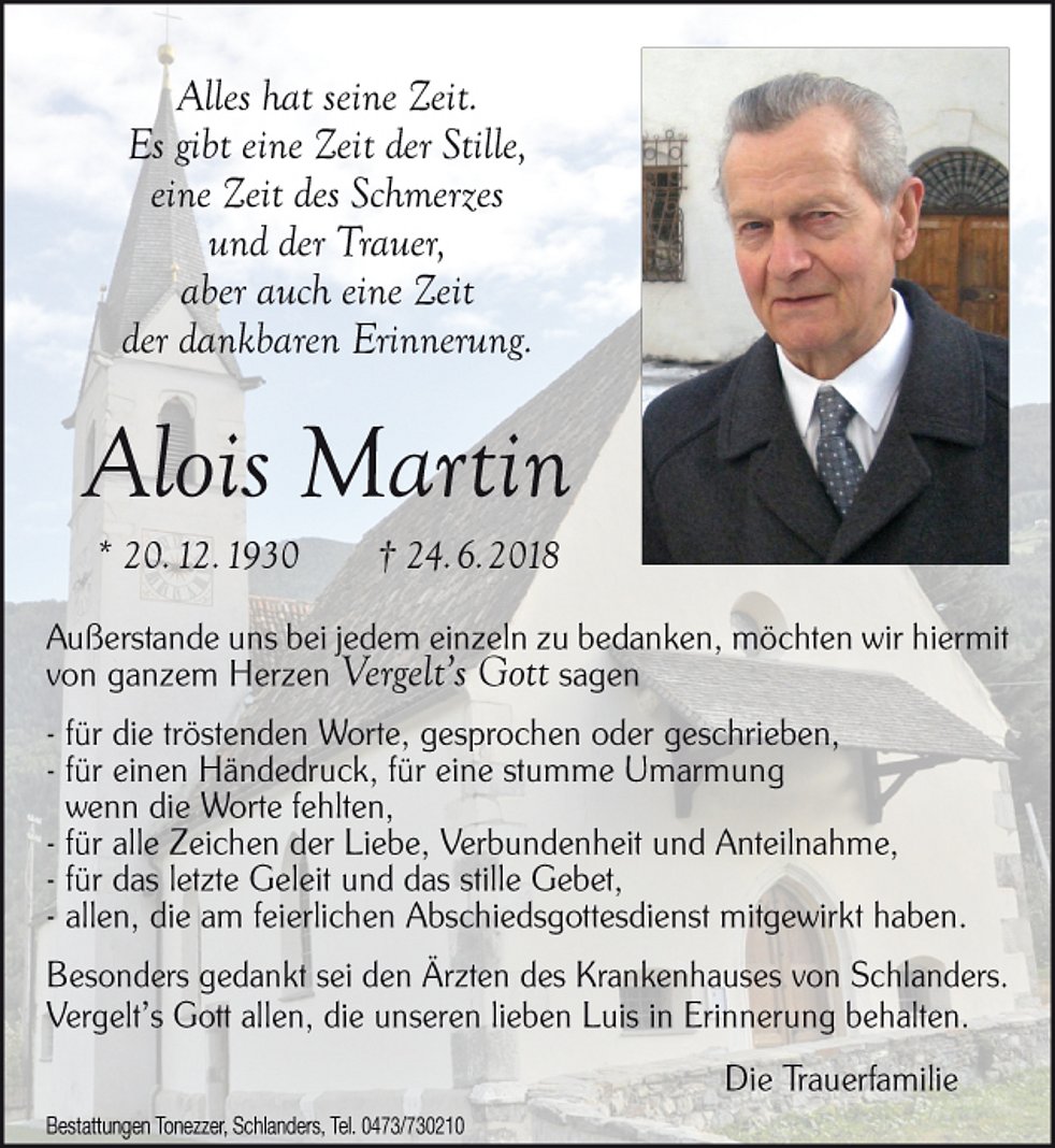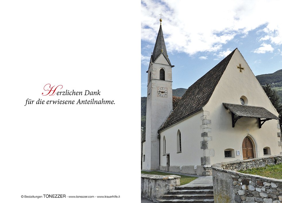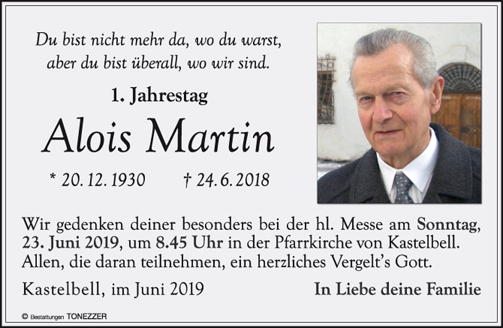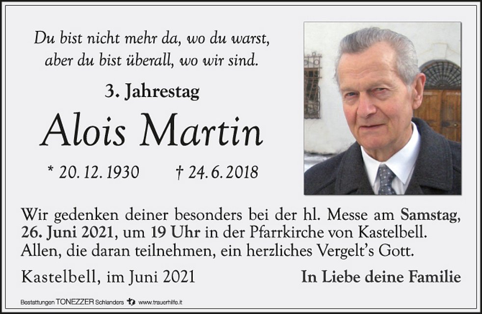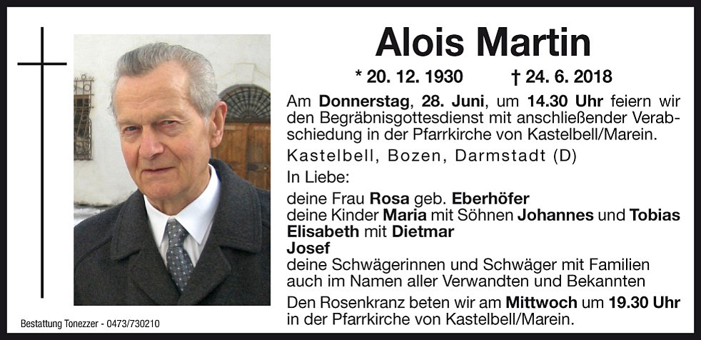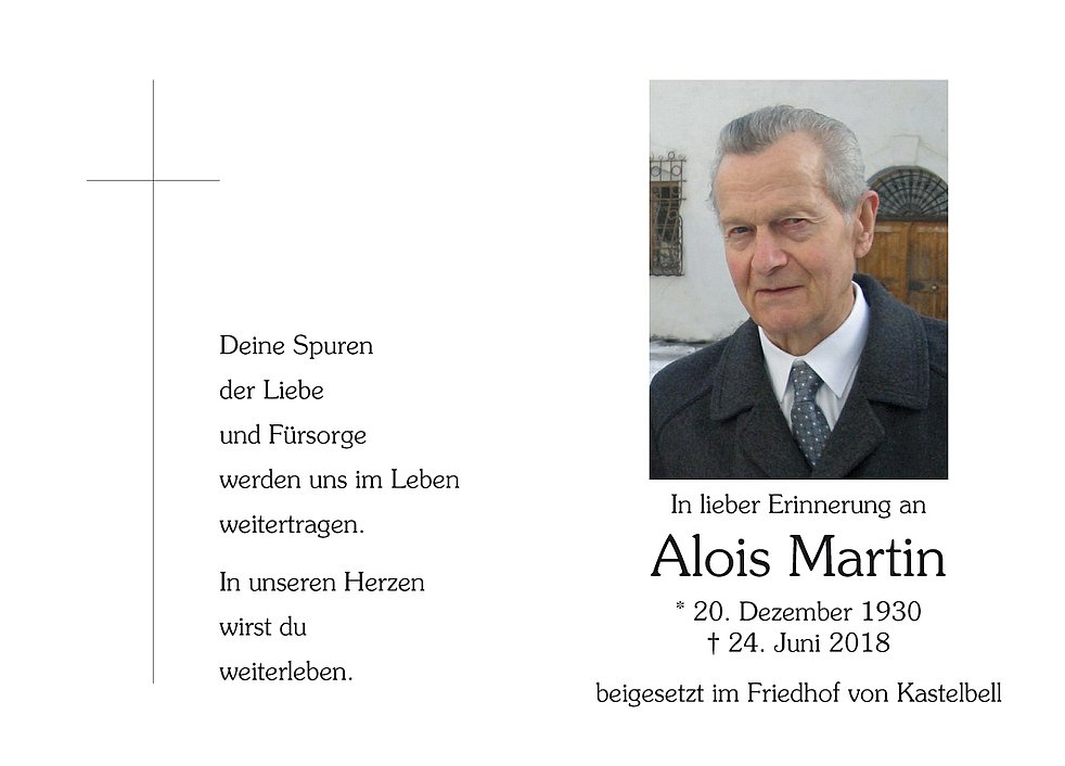 Am Donnerstag, 28. Juni, um 14.30 Uhr feiern wir den Begräbnisgottesdienst mit anschließender Verabschiedung in der Pfarrkirche von Kastelbell/Marein.