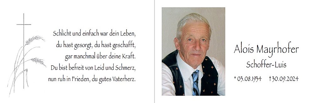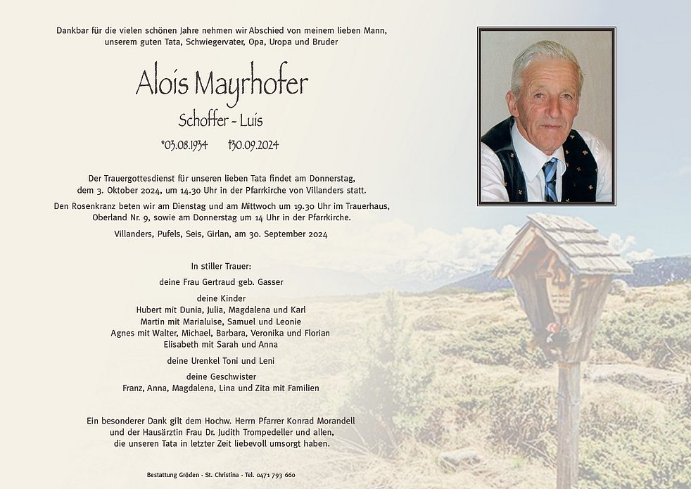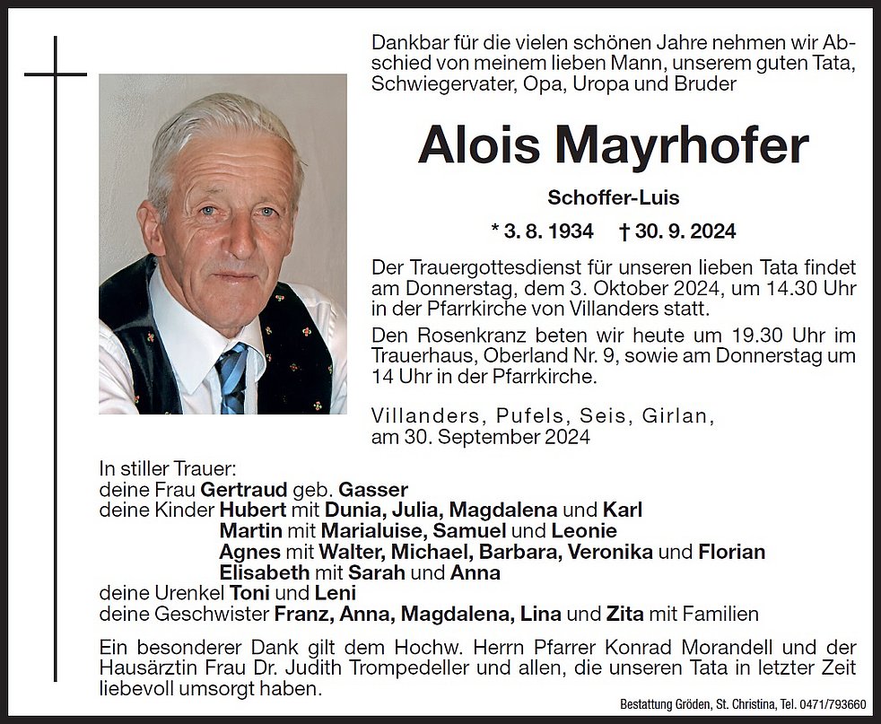 Der Trauergottesdienst für unseren lieben Tata findet am Donnerstag, dem 3. Oktober 2024, um 14.30 Uhr in der Pfarrkirche von Villanders statt.