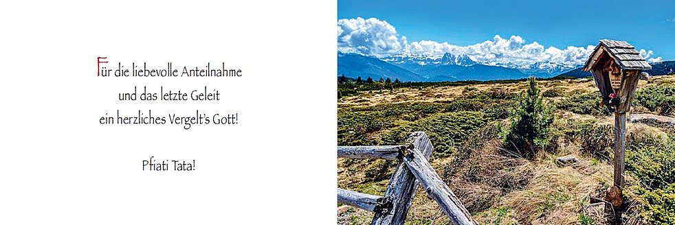 Ein besonderer Dank gilt dem Hochw. Herrn Pfarrer Konrad Morandell und der Hausärztin Frau Dr. Judith Trompedeller und allen, die unseren Tata in letzter Zeit liebevoll umsorgt haben.