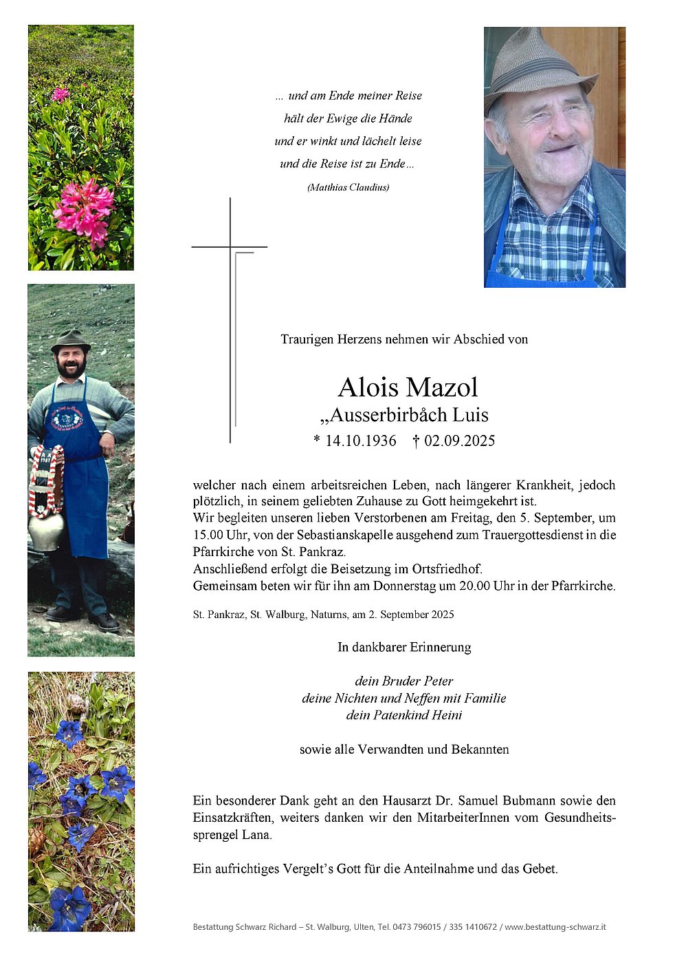 Wir begleiten unseren lieben Verstorbenen am Freitag, den 5. September, um 15.00 Uhr, von der Sebastianskapelle ausgehend zum Trauergottesdienst in die Pfarrkirche von St. Pankraz.