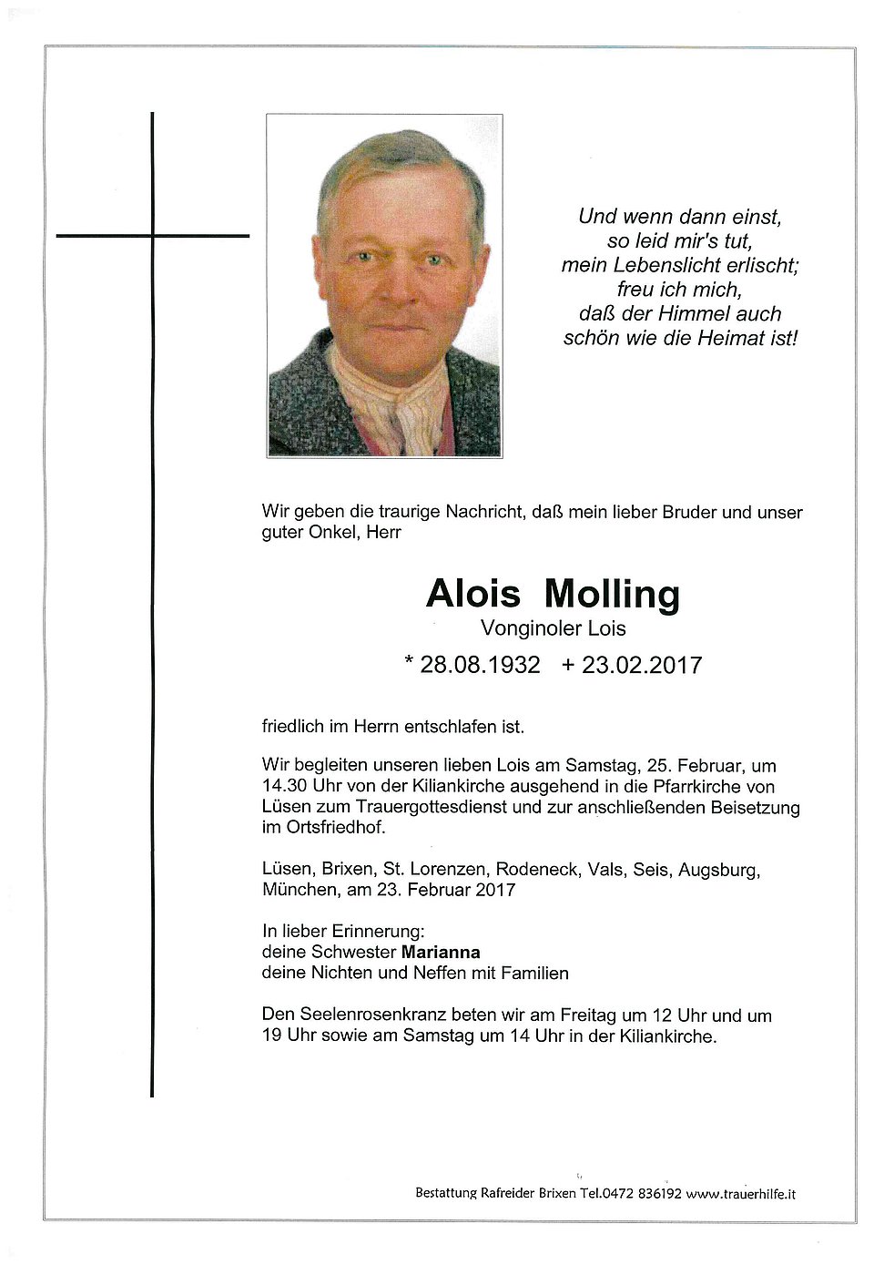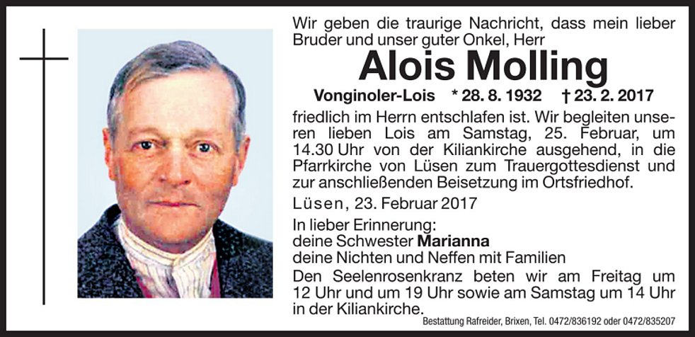 Wir begleiten unseren lieben Lois am Samstag, 25. Februar, um 14.30 Uhr von der Kiliankirche ausgehend in die Pfarrkirche von Lüsen zum Trauergottesdienst und zur anschließenden Beisetzung im Ortsfriedhof.