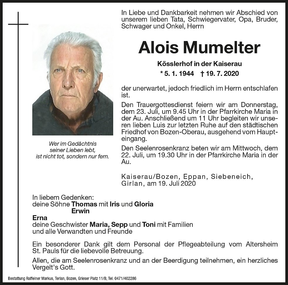 Den Trauergottesdienst feiern wir am Donnerstag, dem 23. Juli, um 9.45 Uhr in der Pfarrkirche Maria in der Au. Anschließend um 11 Uhr begleiten wir unseren lieben Luis zur letzten Ruhe auf den städtischen Friedhof von Bozen-Oberau, ausgehend vom Haupteingang.
