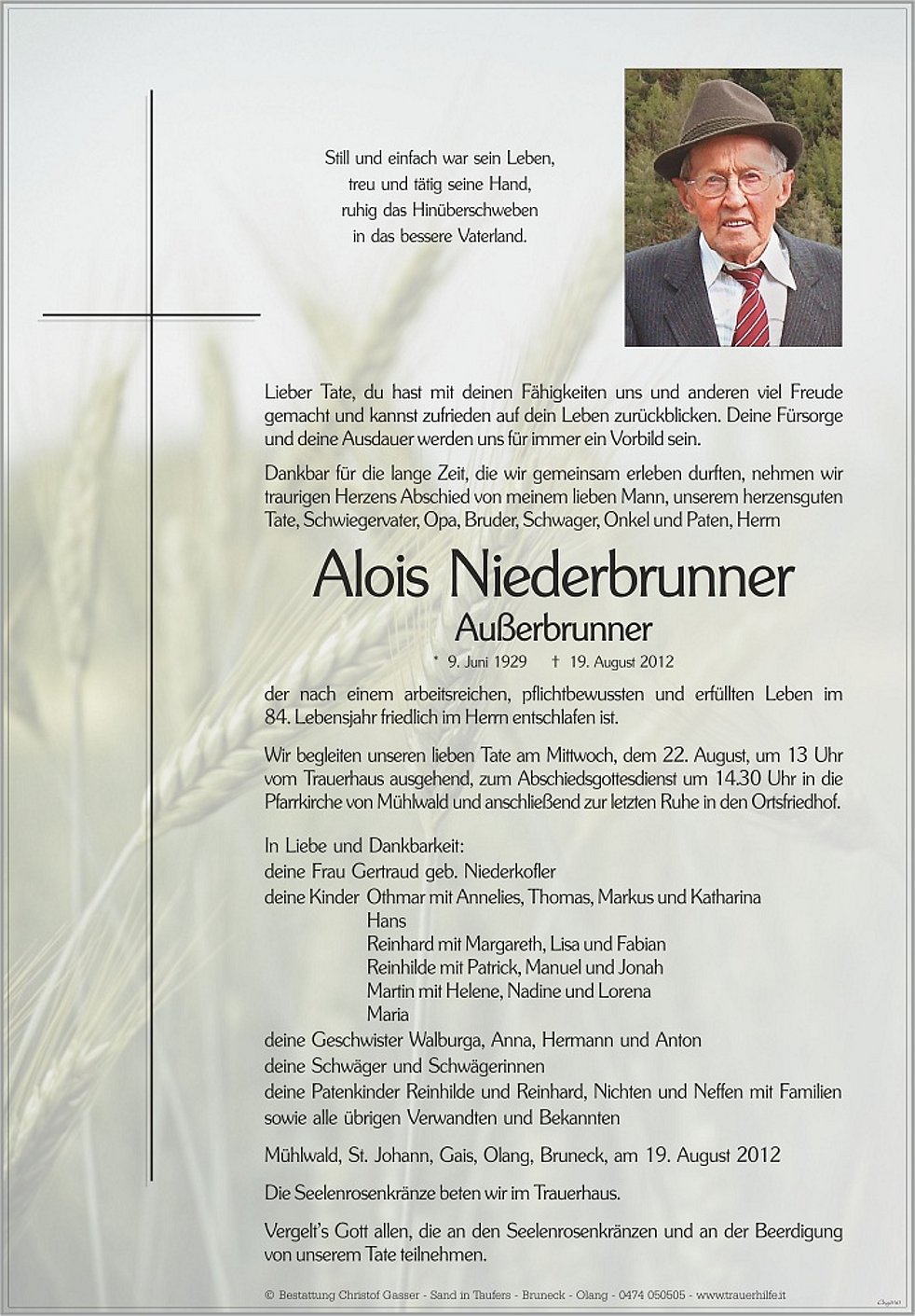 Wir begleiten unseren lieben Tate am Mittwoch, dem 22. August, um 13 Uhr vom Trauerhaus ausgehend, zum Abschiedsgottesdienst um 14.30 Uhr in die Pfarrkirche von Mühlwald und anschließend zur letzten Ruhe in den Ortsfriedhof.