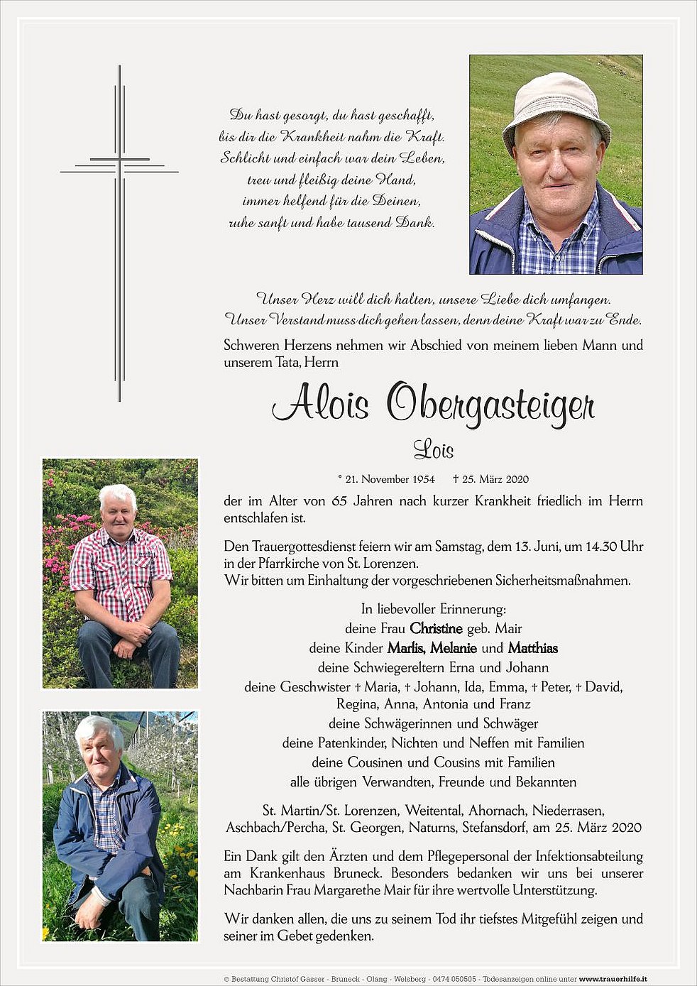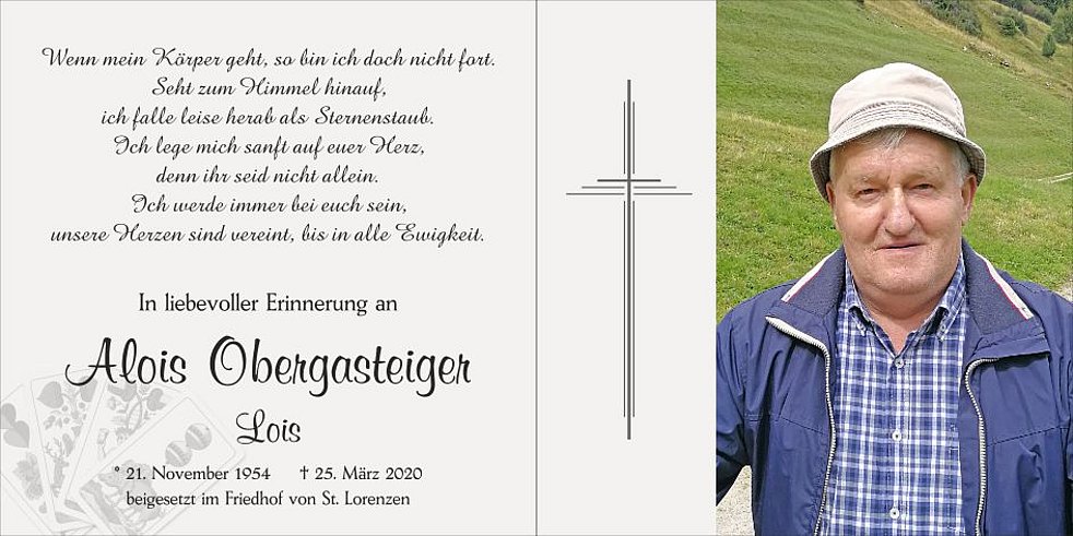 Den Trauergottesdienst feiern wir am Samstag, dem 13. Juni, um 14.30 Uhr in der Pfarrkirche von St. Lorenzen.