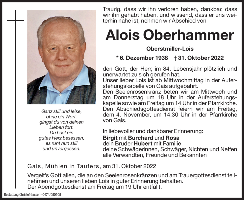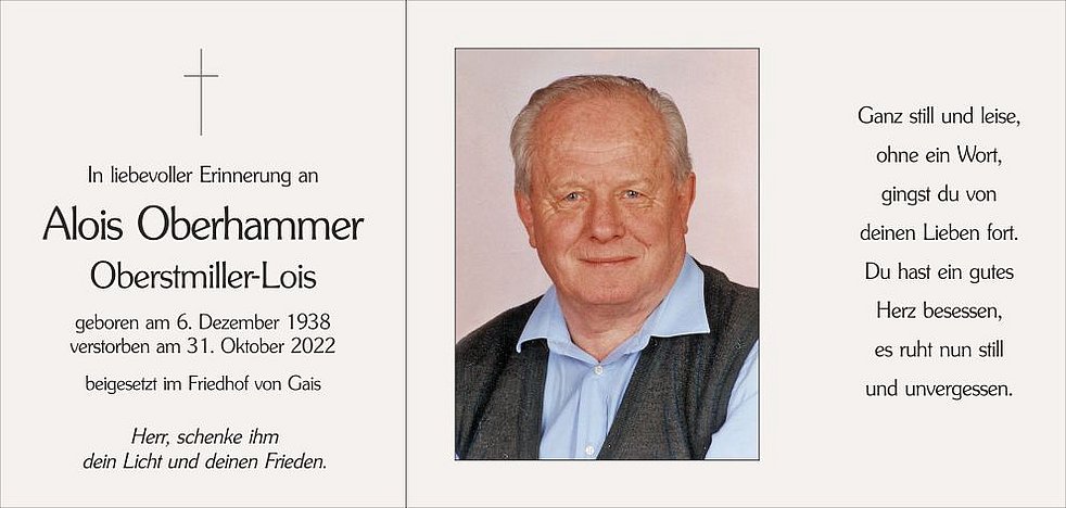 Am 31. Oktober hat Gott, der Herr, plötzlich und unerwartet unseren lieben Alois zu sich gerufen hat.