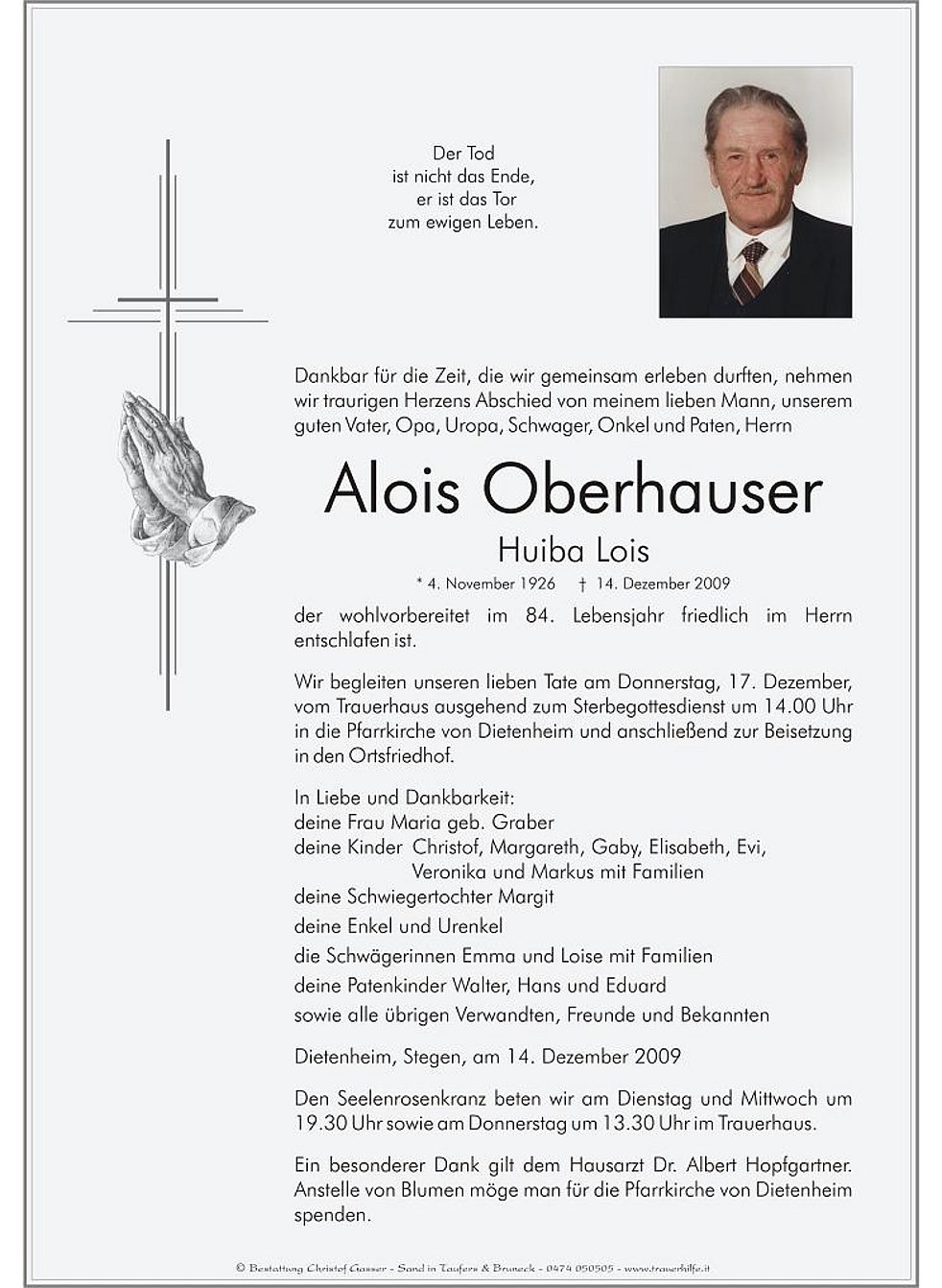 Ein besonderer Dank gilt dem Hausarzt Dr. Albert Hopfgartner. Anstelle von Blumen möge man für die Pfarrkirche von Dietenheim spenden.