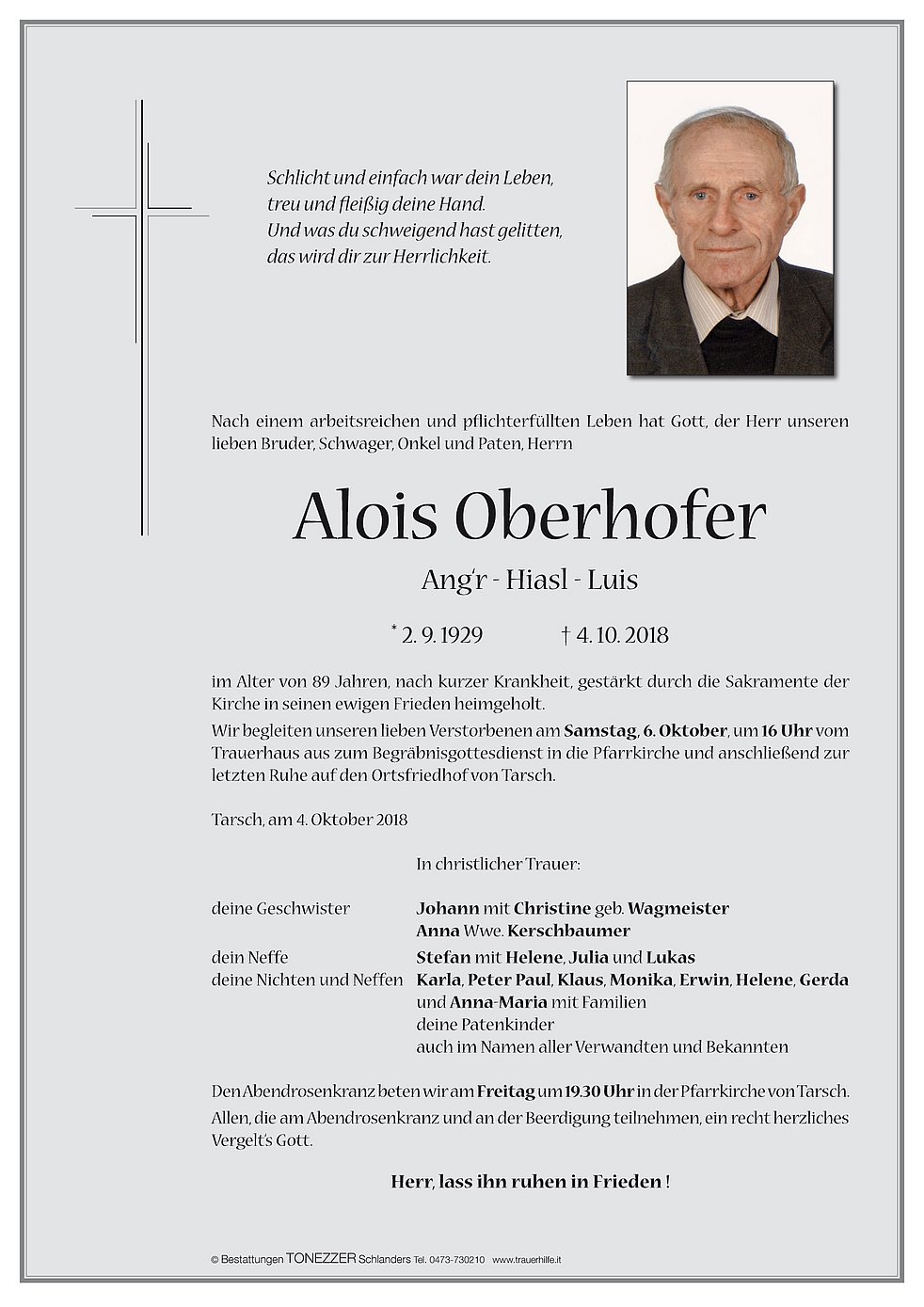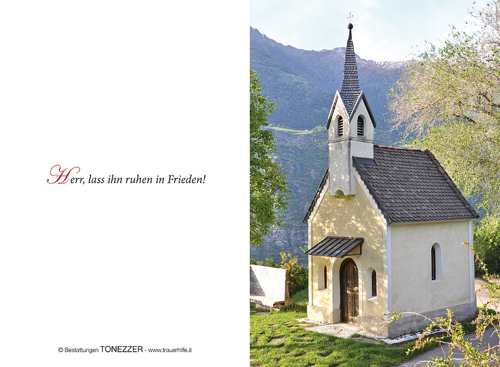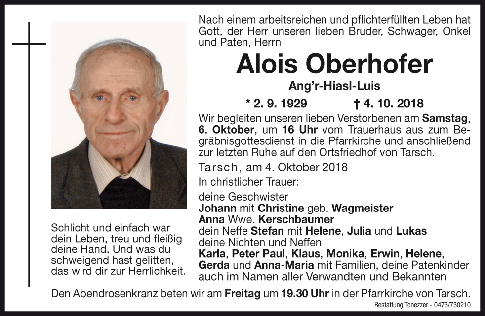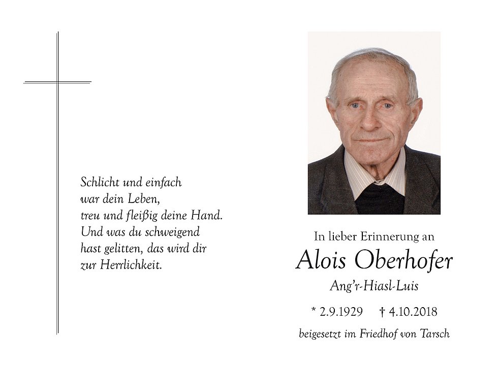 Wir begleiten unseren lieben Verstorbenen am Samstag, 6. Oktober, um 16 Uhr vom Trauerhaus aus zum Begräbnisgottesdienst in die Pfarrkirche und anschließend zur letzten Ruhe auf den Ortsfriedhof von Tarsch.