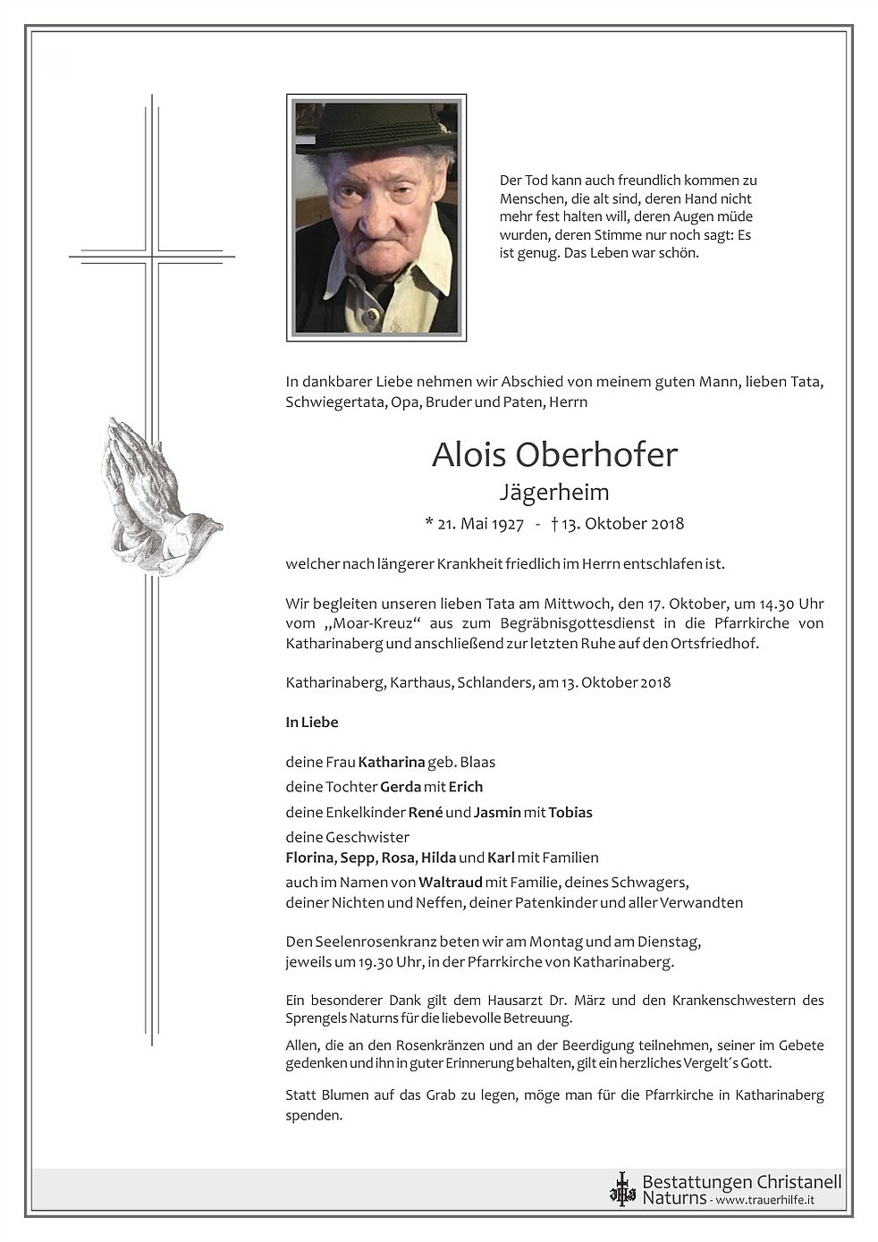 Wir begleiten unseren lieben Tata am Mittwoch, den 17. Oktober, um 14.30 Uhr vom „Moar-Kreuz“ aus zum Begräbnisgottesdienst in die Pfarrkirche von Katharinaberg und anschließend zur letzten Ruhe auf den Ortsfriedhof.