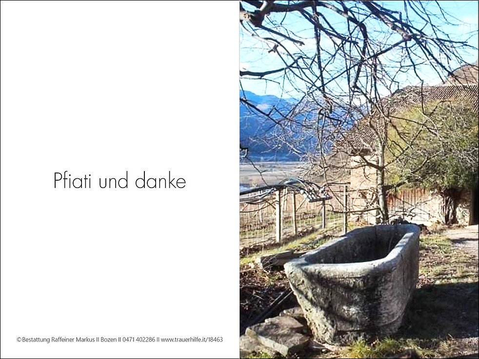 Ein besonderer Dank gilt dem Hausarzt und dem Sozialsprengel Terlan sowie dem gesamten Personal des Altersheims St. Pauls für die liebevolle Betreuung.