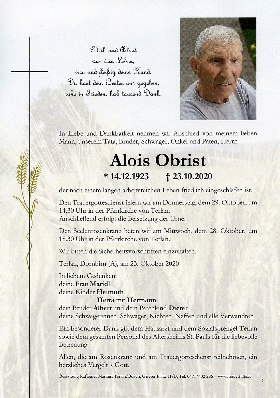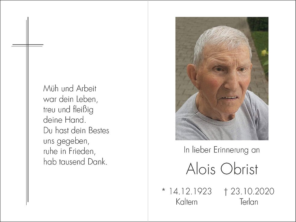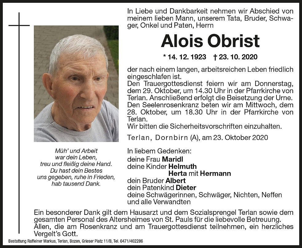 Den Trauergottesdienst feiern wir am Donnerstag, dem 29. Oktober, um 14.30 Uhr in der Pfarrkirche von Terlan. Anschließend erfolgt die Beisetzung der Urne.