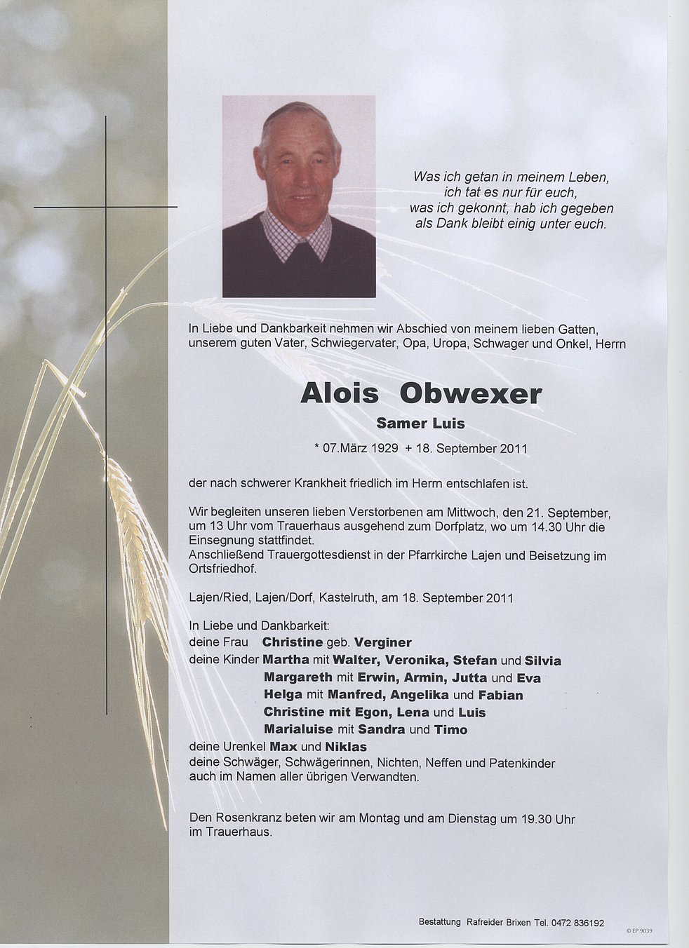 Ein besonderer Dank gilt unserem Hausarzt Dr. Karl Lintner, dem Haus- und Krankenpflegedienst Sprengel Klausen, den Ärzten und dem Pflegepersonal der Abteilung Medizin II vom Krankenhaus Brixen und Tante Lotti für die liebevolle Betreuung, sowie allen, die an den Rosenkränzen und an der Beerdigung teilnehmen.