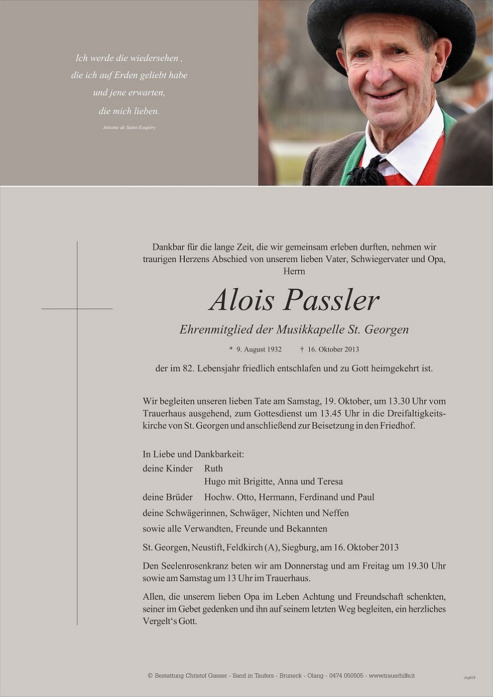 Wir begleiten unseren lieben Tate am Samstag, 19. Oktober, um 13.30 Uhr vom Trauerhaus ausgehend, zum Gottesdienst um 13.45 Uhr in die Dreifaltigkeits-kirche von St. Georgen und anschließend zur Beisetzung in den Friedhof.
