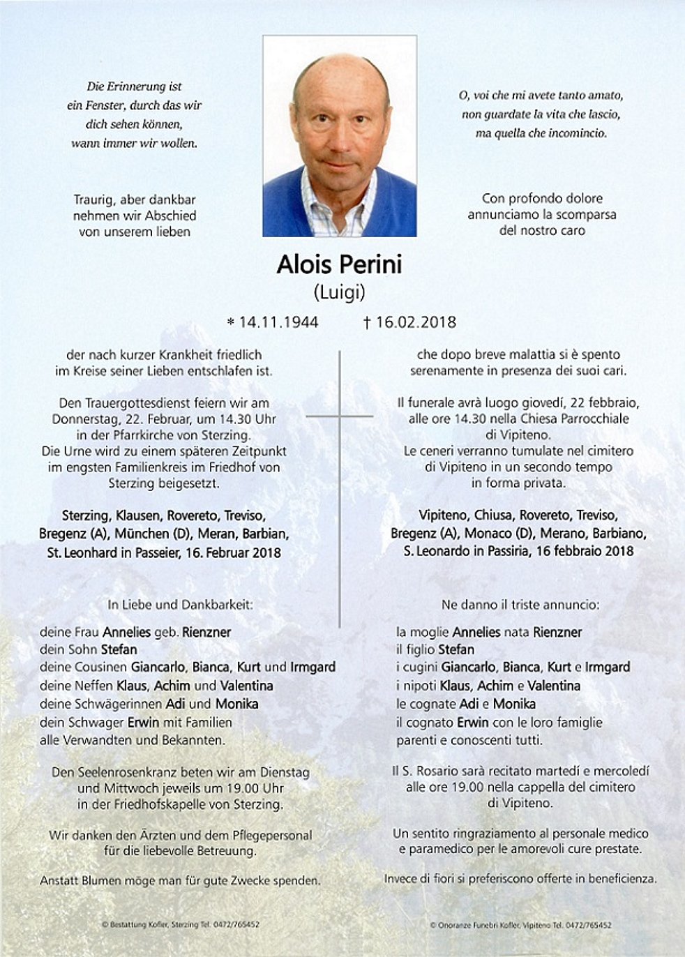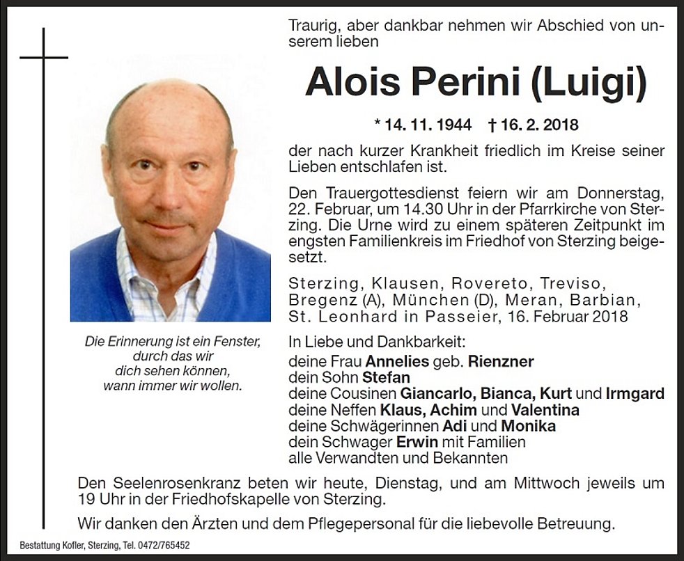 Il funerale avrà luogo giovedí, 22 febbraio, alle ore 14.30 nella Chiesa Parrocchiale di Vipiteno.