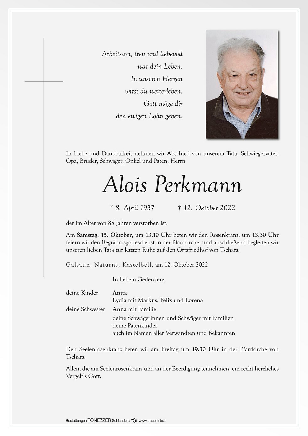 Am Samstag, 15. Oktober, um 13.10 Uhr beten wir den Rosenkranz; um 13.30 Uhr feiern wir den Begräbnisgottesdienst in der Pfarrkirche, und anschließend begleiten wir unseren lieben Tata zur letzten Ruhe auf den Ortsfriedhof von Tschars.