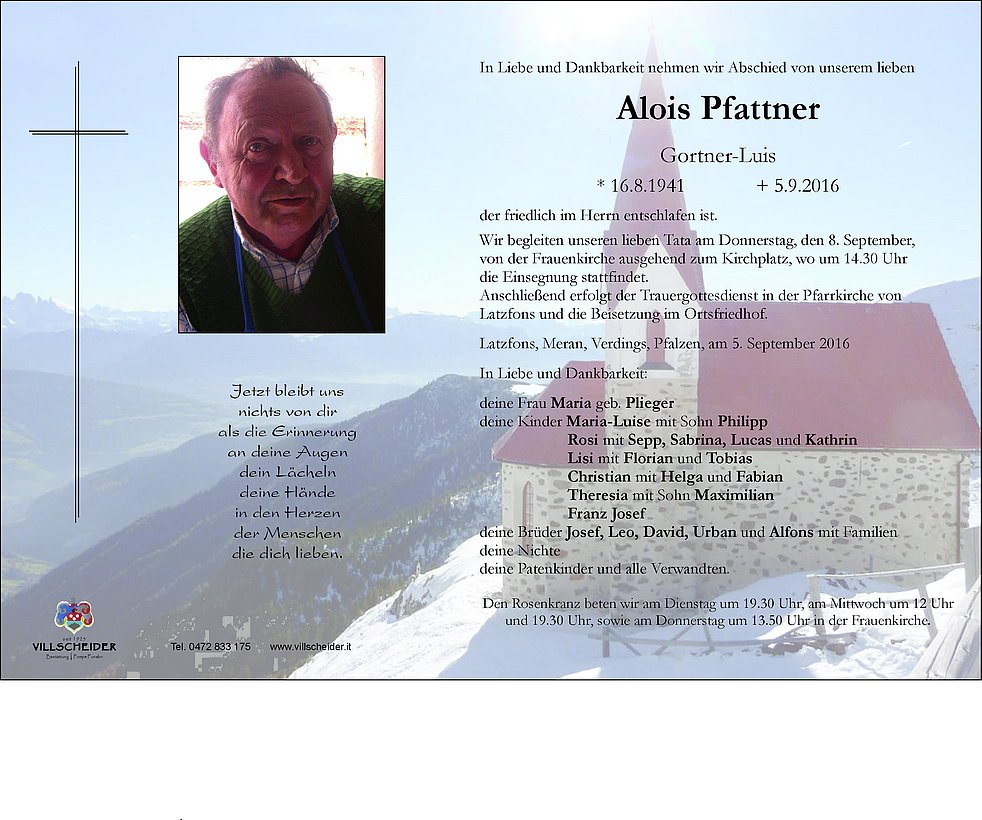 Anschließend erfolgt der Trauergottesdienst in der Pfarrkirche von Latzfons und die Beisetzung im Ortsfriedhof.