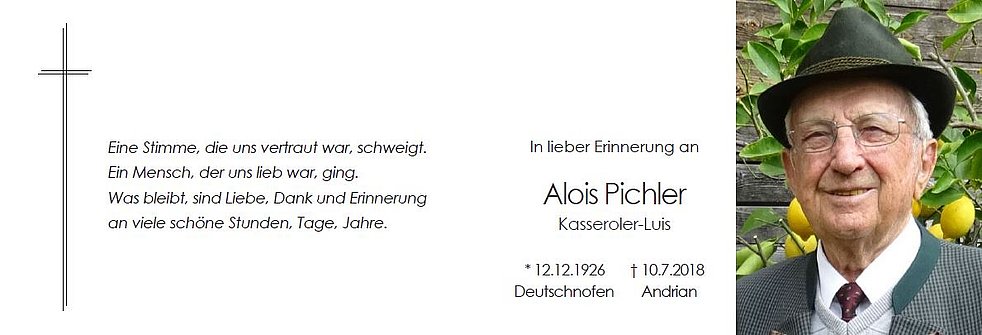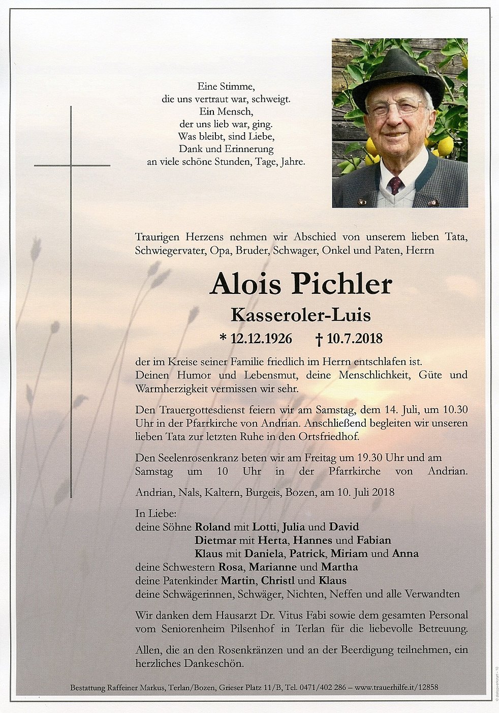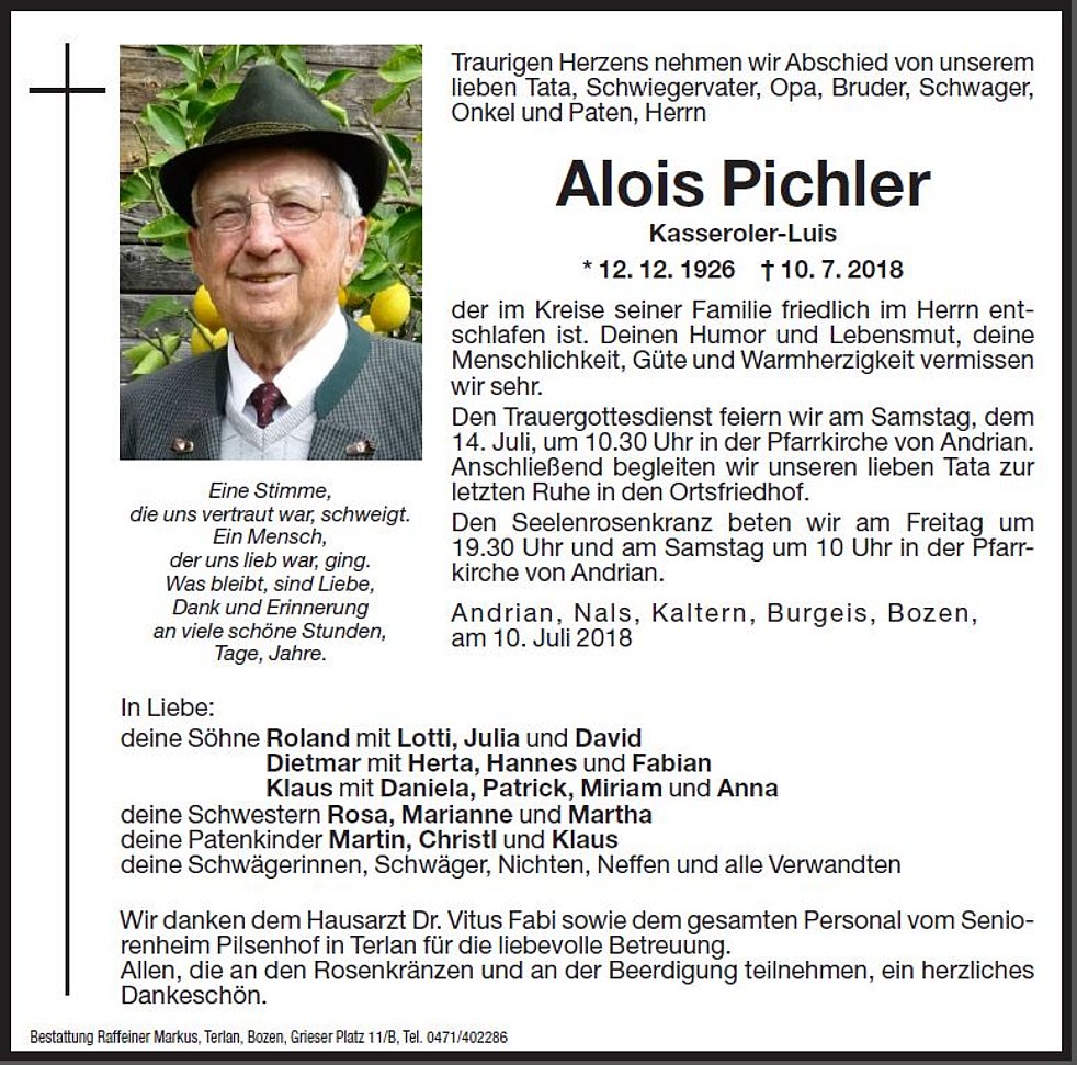 Den Trauergottesdienst feiern wir am Samstag, dem 14. Juli, um 10.30 Uhr in der Pfarrkirche von Andrian. Anschließend begleiten wir unseren lieben Tata zur letzten Ruhe in den Ortsfriedhof.