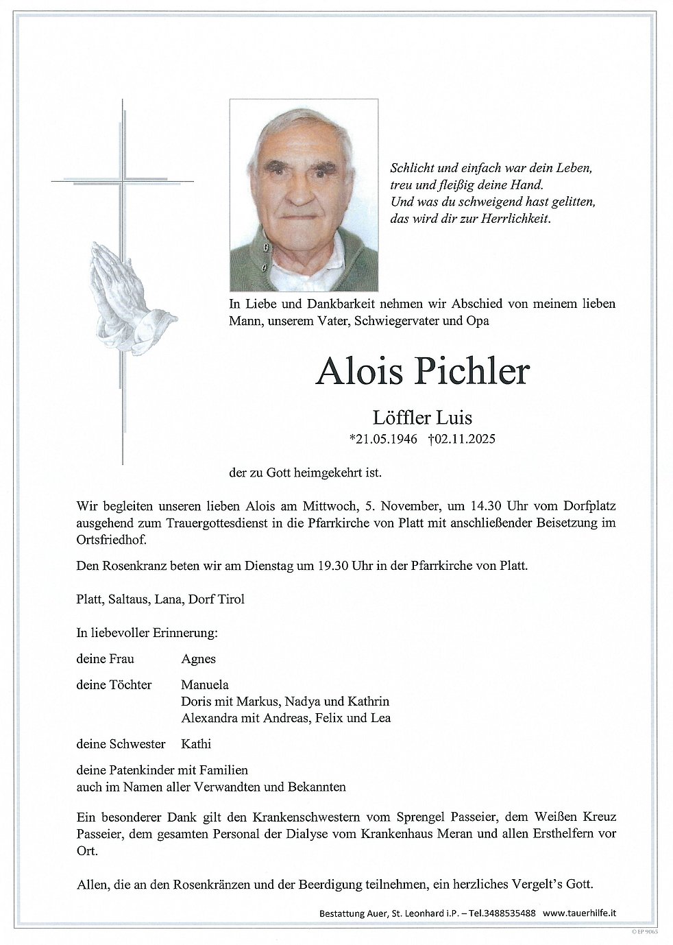 Wir begleiten unseren lieben Alois am Mittwoch, 5. November, um 14.30 Uhr vom Dorfplatz ausgehend zum Trauergottesdienst in die Pfarrkirche von Platt mit anschließender Beisetzung im Ortsfriedhof.