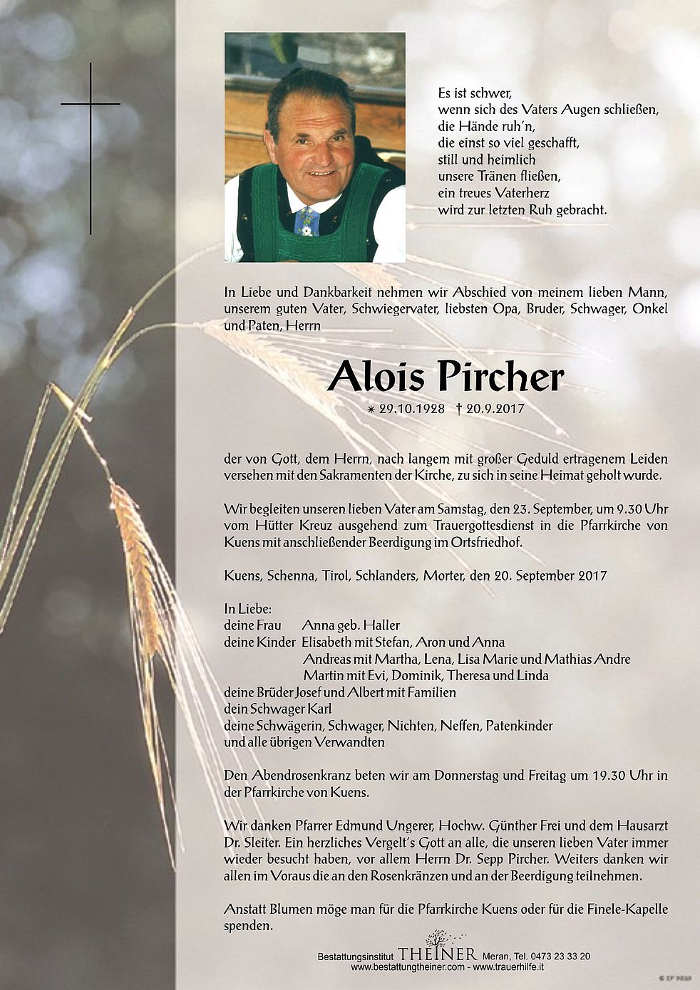 Wir danken Pfarrer Edmund Ungerer, Hochw. Günther Frei und dem Hausarzt Dr. Sleiter. Ein herzliches Vergelt‘s Gott an alle, die unseren lieben Vater immer wieder besucht haben, vor allem Herrn Dr. Sepp Pircher. Weiters danken wir allen im Voraus die an den Rosenkränzen und an der Beerdigung teilnehmen.