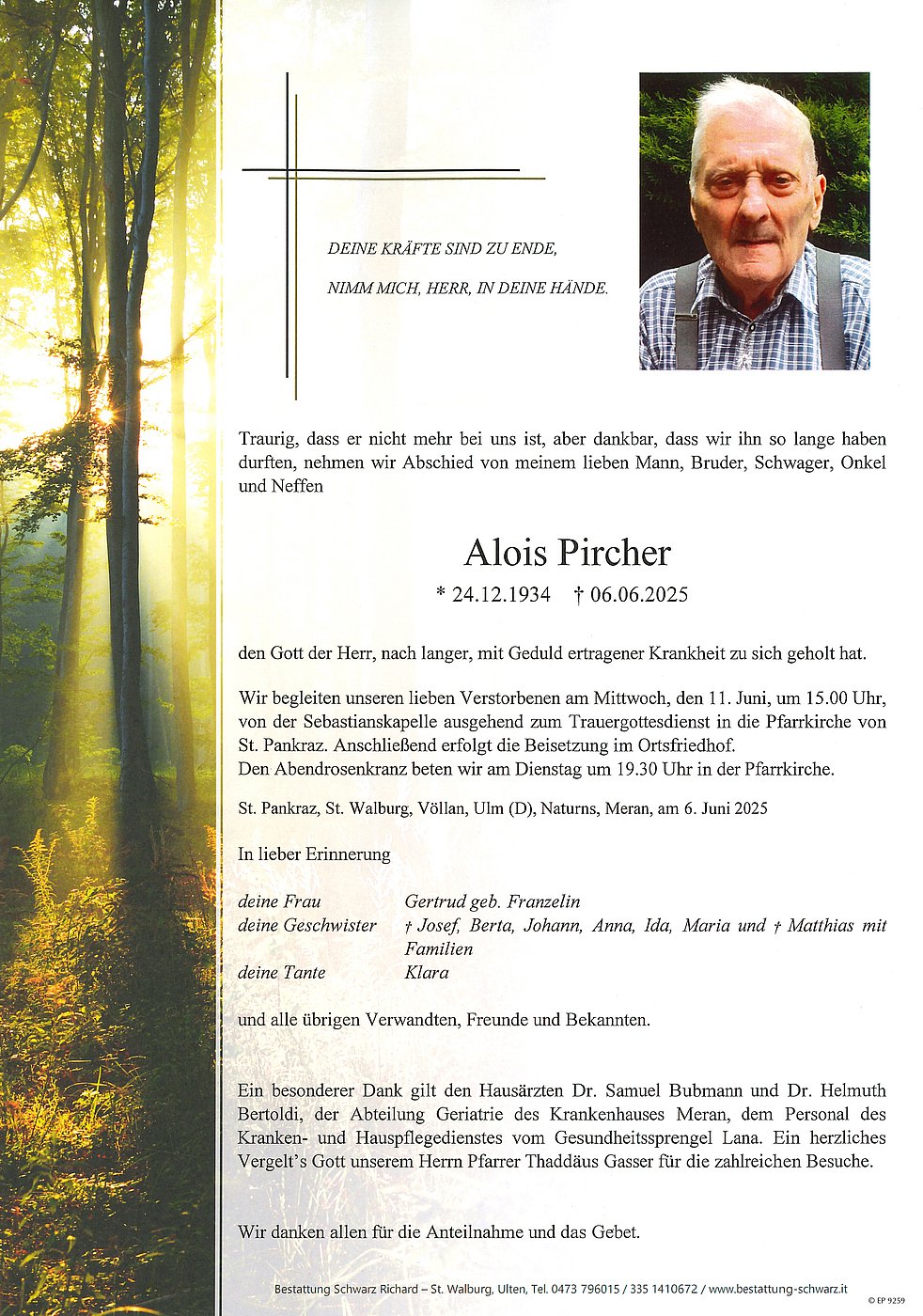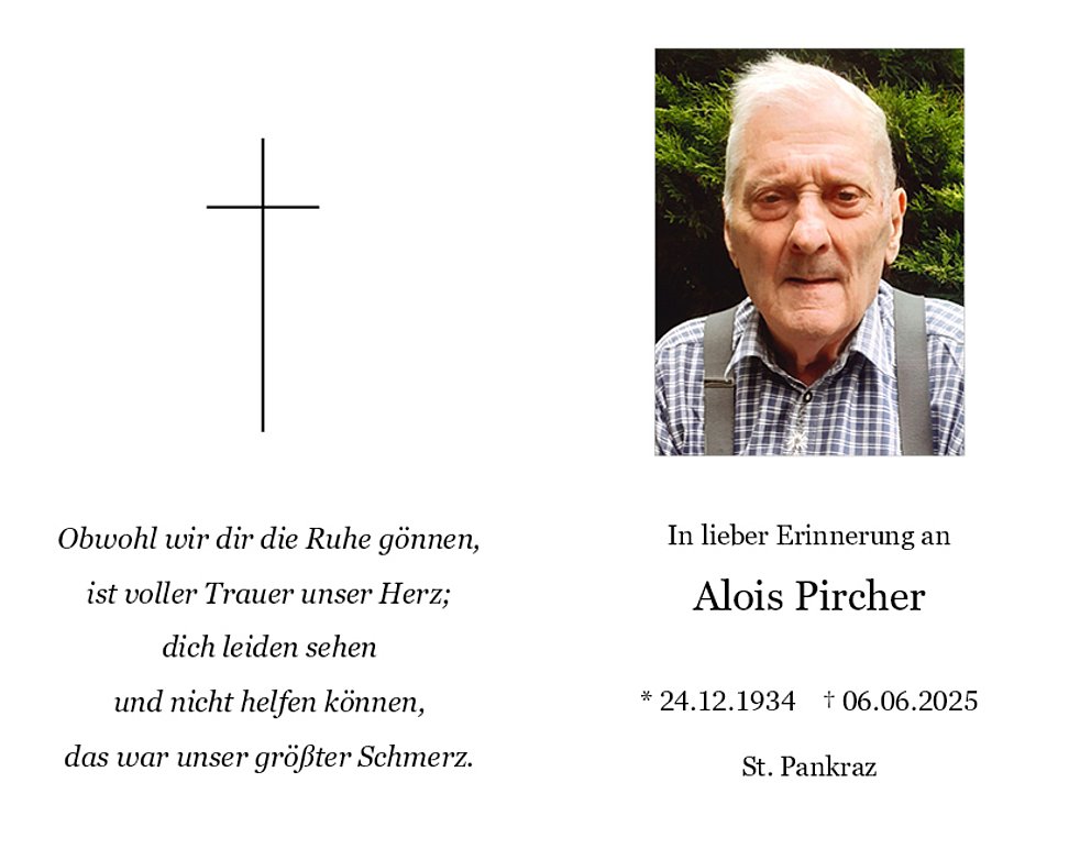 Wir begleiten unseren lieben Verstorbenen am Mittwoch, den 11. Juni, um 15.00 Uhr, von der Sebastianskapelle ausgehend zum Trauergottesdienst in die Pfarrkirche von St. Pankraz. Anschließend erfolgt die Beisetzung im Ortsfriedhof.