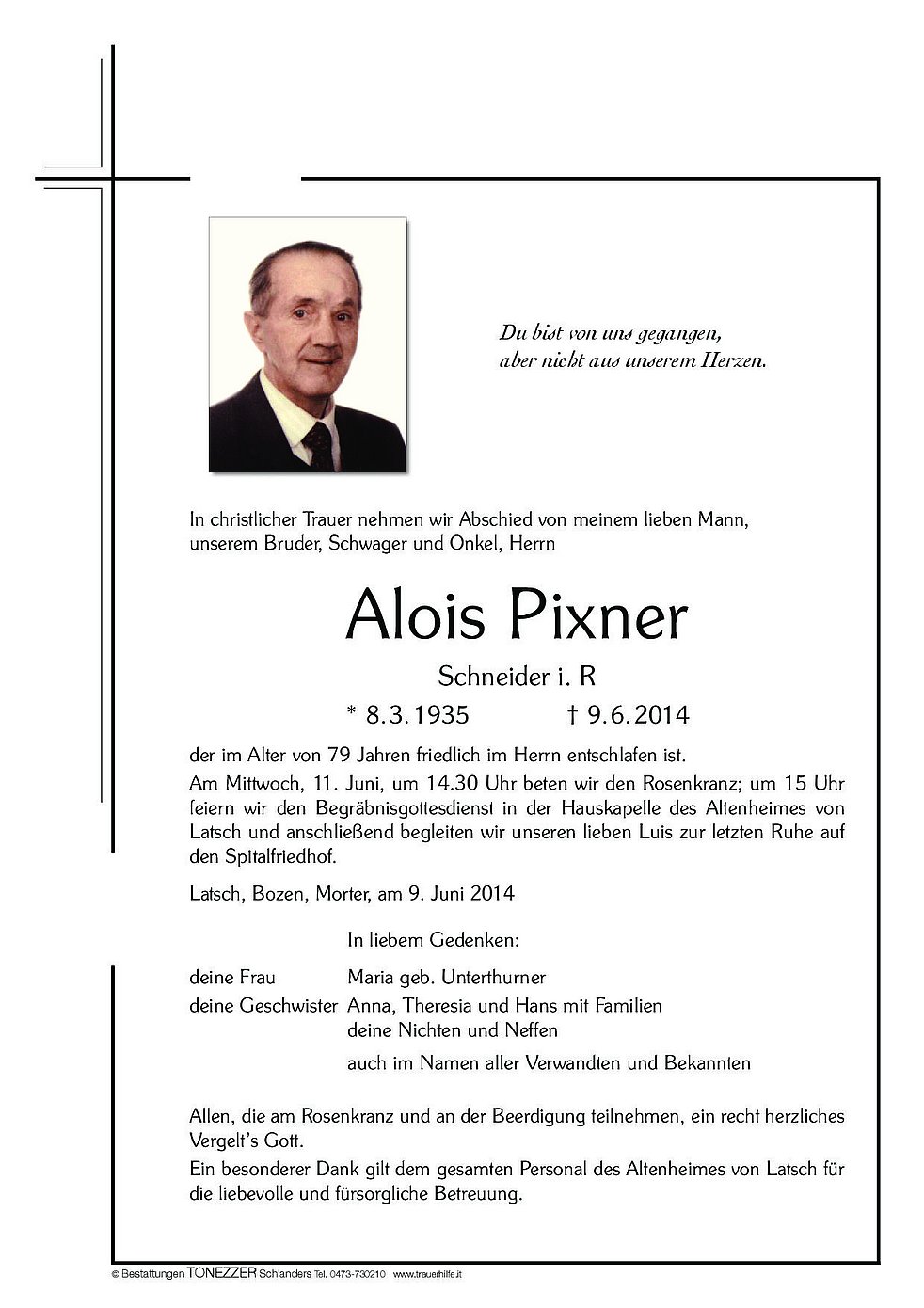 Am Mittwoch, 11. Juni, um 14.30 Uhr beten wir den Rosenkranz; um 15 Uhr feiern wir den Begräbnisgottesdienst in der Hauskapelle des Altenheimes von Latsch und anschließend begleiten wir unseren lieben Luis zur letzten Ruhe auf den Spitalfriedhof.
