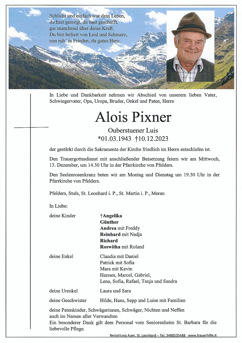 Den Trauergottesdienst mit anschließender Beisetzung feiern wir am Mittwoch, 13. Dezember, um 14.30 Uhr in der Pfarrkirche von Pfelders.