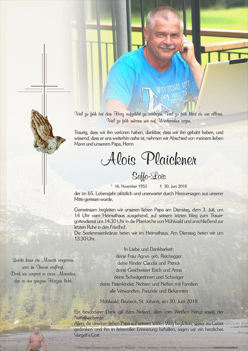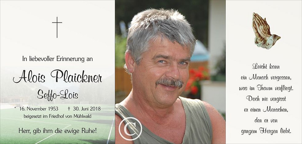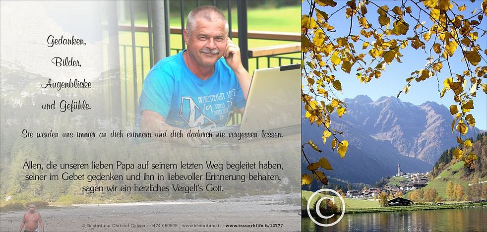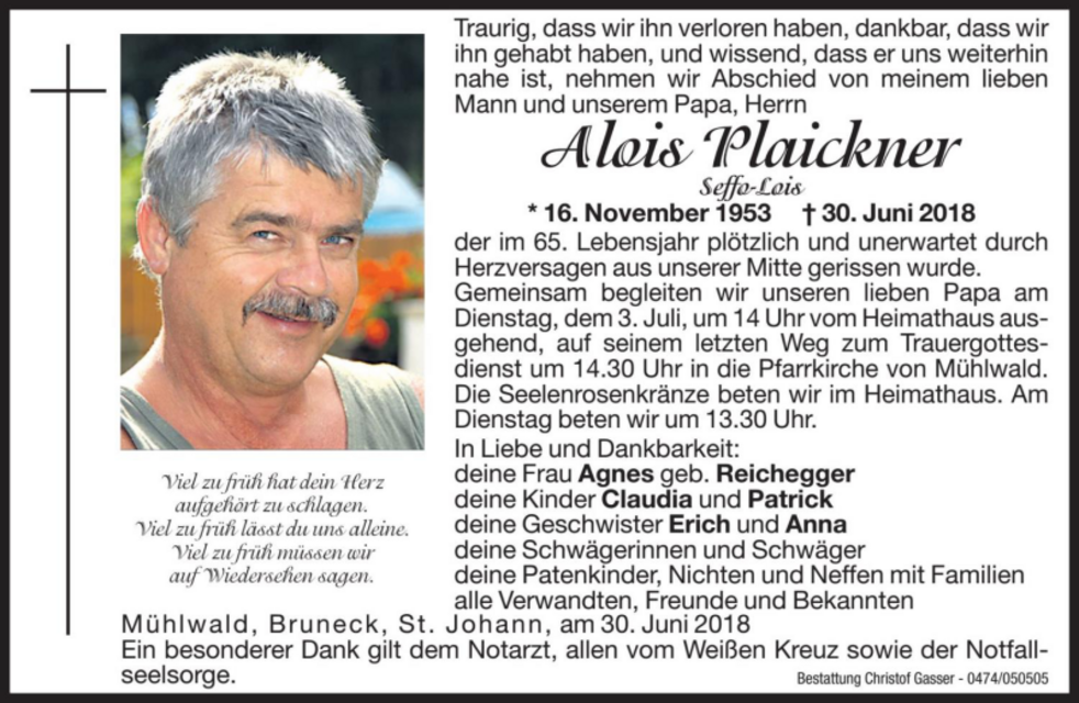 Gemeinsam begleiten wir unseren lieben Papa am Dienstag, dem 3. Juli, um 14 Uhr vom Heimathaus ausgehend, auf seinem letzten Weg zum Trauergottesdienst um 14.30 Uhr in die Pfarrkirche von Mühlwald und anschließend zur letzten Ruhe in den Friedhof.