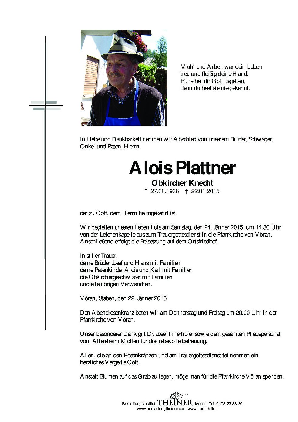 Anstatt Blumen auf das Grab zu legen, möge man für die Pfarrkirche Vöran spenden.