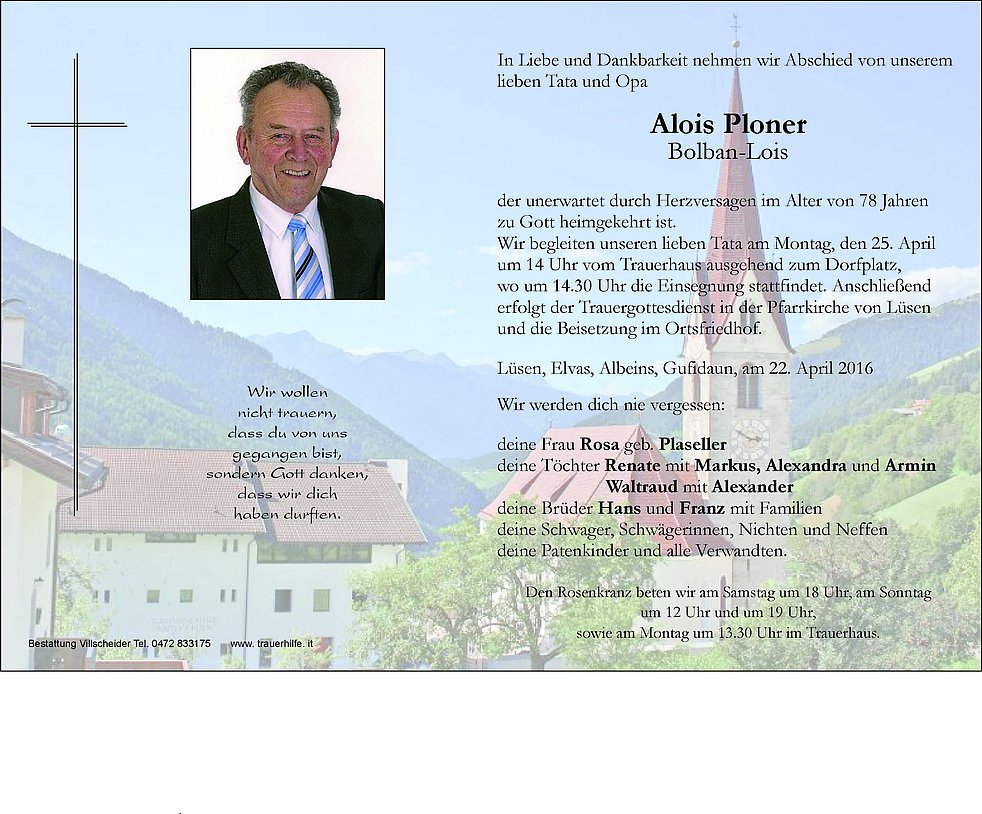 wo um 14.30 Uhr die Einsegnung stattfindet. Anschließend erfolgt der Trauergottesdienst in der Pfarrkirche von Lüsen und die Beisetzung im Ortsfriedhof.