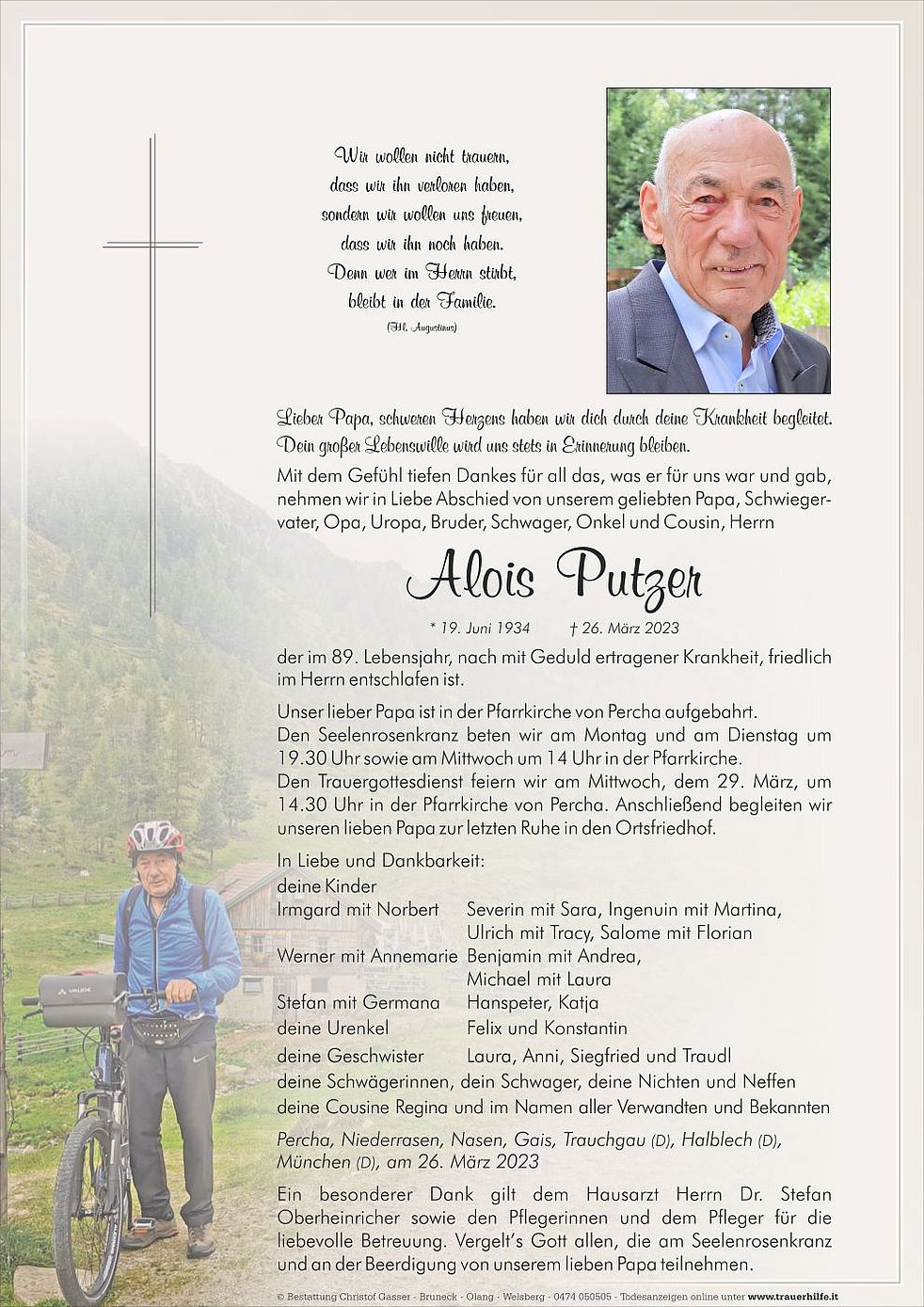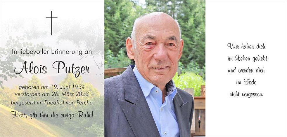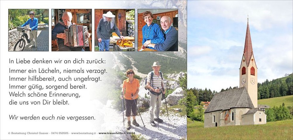 Den Trauergottesdienst feiern wir am Mittwoch, dem 29. März, um 14.30 Uhr in der Pfarrkirche von Percha. Anschließend begleiten wir unseren lieben Papa zur letzten Ruhe in den Ortsfriedhof.