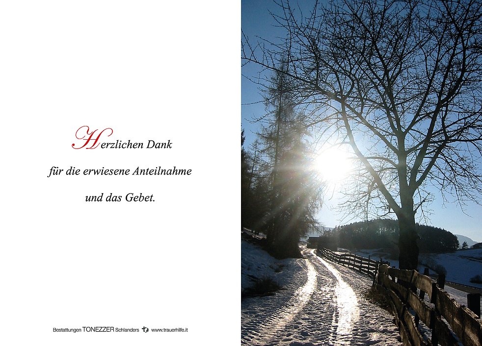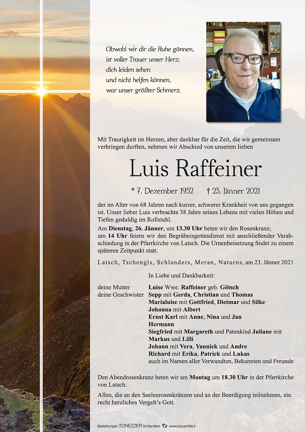 Am Dienstag, 26. Jänner, um 13.30 Uhr beten wir den Rosenkranz; um 14 Uhr feiern wir den Begräbnisgottesdienst mit anschließender Verabschiedung in der Pfarrkirche von Latsch.