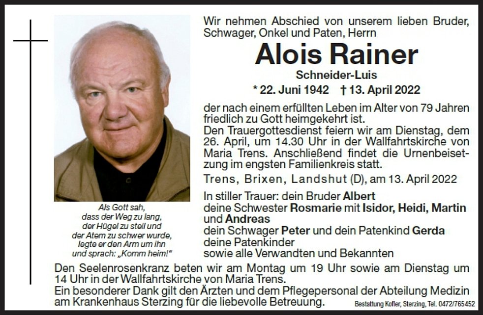 Den Trauergottesdienst feiern wir am Dienstag, dem 26. April, um 14.30 Uhr in der Wallfahrtskirche von Maria Trens. Anschließend findet die Urnenbeisetzung im engsten Familienkreis statt.