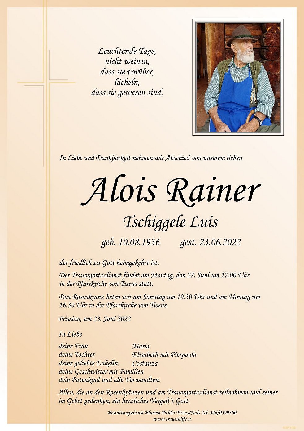 Der Trauergottesdienst findet am Montag, den 27. Juni um 17.00 Uhr