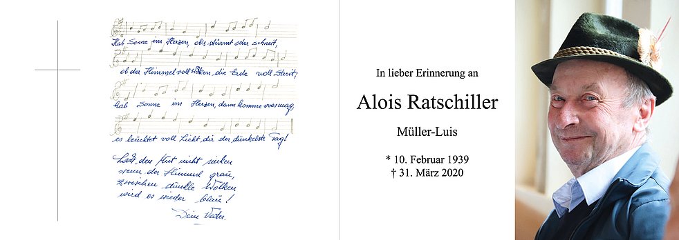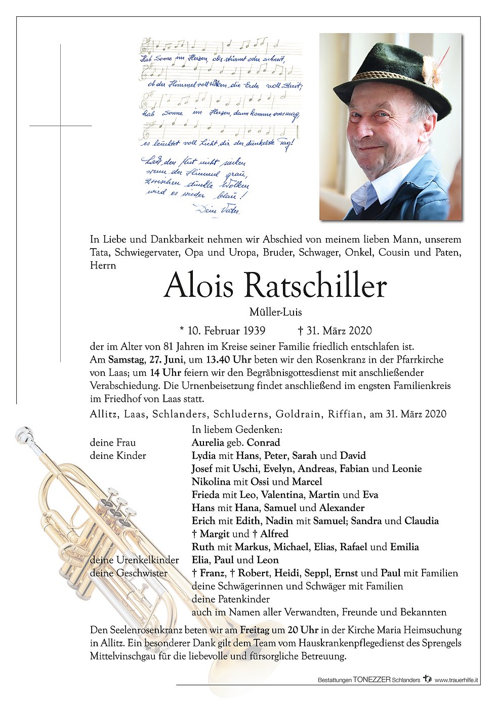 Am Samstag, 27. Juni, um 13.40 Uhr beten wir den Rosenkranz in der Pfarrkirche von Laas; um 14 Uhr feiern wir den Begräbnisgottesdienst mit anschließender Verabschiedung. Die Urnenbeisetzung findet anschließend im engsten Familienkreis im Friedhof von Laas statt.