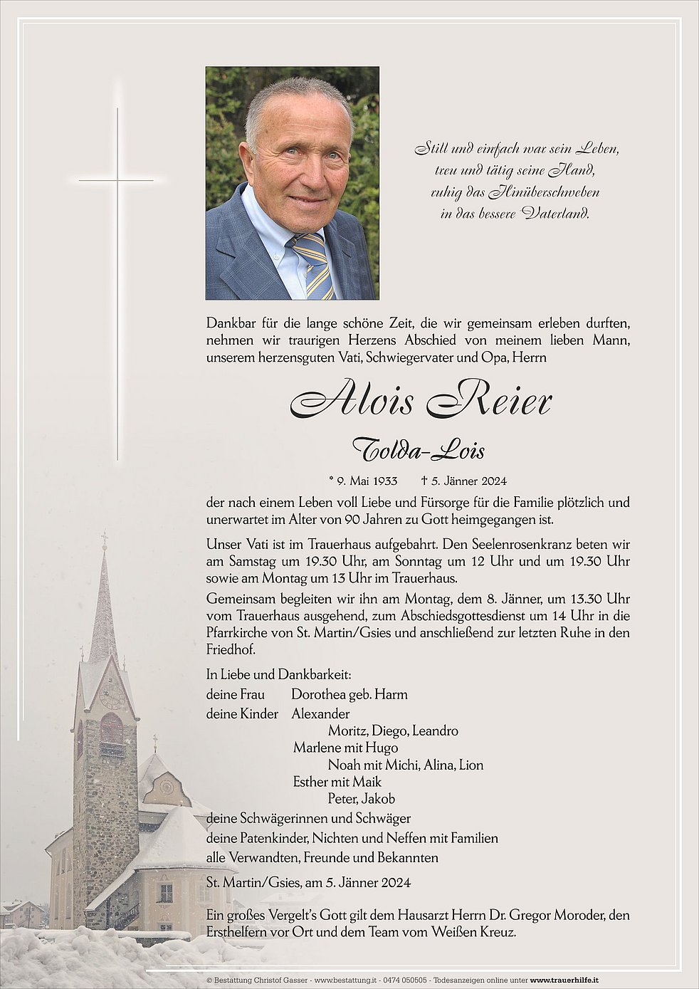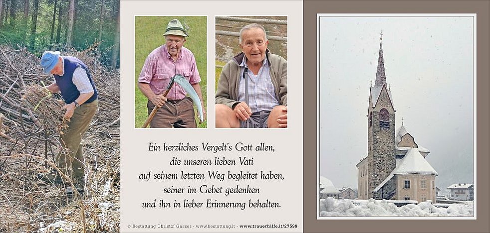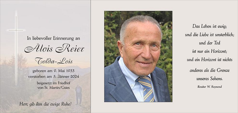 Gemeinsam begleiten wir ihn am Montag, dem 8. Jänner, um 13.30 Uhr vom Trauerhaus ausgehend, zum Abschiedsgottesdienst um 14 Uhr in die Pfarrkirche von St. Martin/Gsies und anschließend zur letzten Ruhe in den Friedhof.