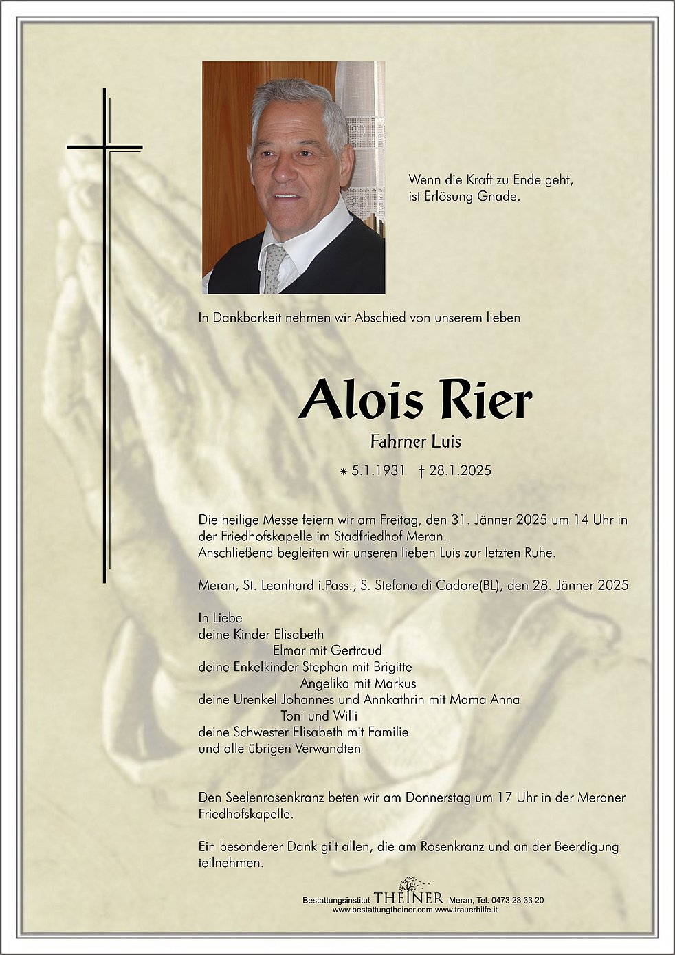 Die heilige Messe feiern wir am Freitag, den 31. Jänner 2025 um 14 Uhr in der Friedhofskapelle im Stadfriedhof Meran.