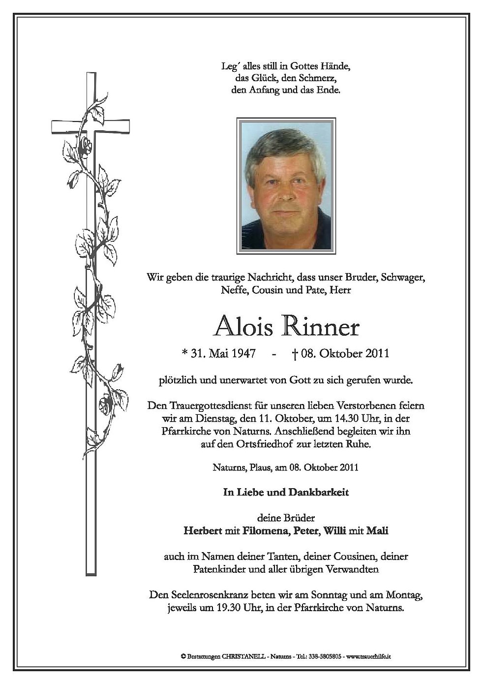 Den Trauergottesdienst für unseren lieben Verstorbenen feiern wir am Dienstag, den 11. Oktober, um 14.30 Uhr, in der Pfarrkirche von Naturns. Anschließend begleiten wir ihn auf den Ortsfriedhof zur letzten Ruhe.