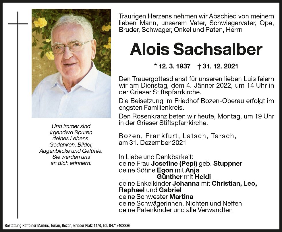 Den Trauergottesdienst für unseren lieben Luis feiern wir am Dienstag, dem 4. Jänner 2022, um 14 Uhr in der Grieser Stiftspfarrkirche.