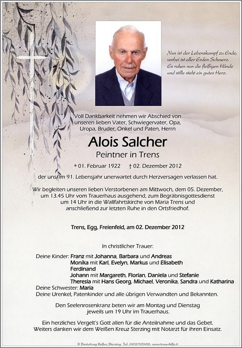 Wir begleiten unseren lieben Verstorbenen am Mittwoch, dem 05. Dezember, um 13.45 Uhr vom Trauerhaus ausgehend, zum Begräbnisgottesdienst um 14 Uhr in die Wallfahrtskirche von Maria Trens und anschließend zur letzten Ruhe in den Ortsfriedhof.