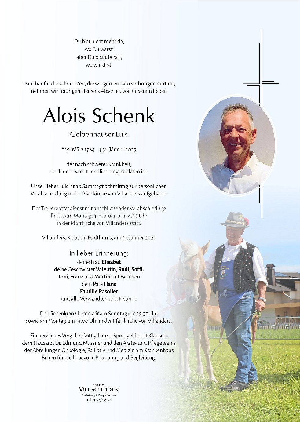 Lieber Luis, so ein hilfsbereiter Mensch warst du! Jedes Mal, wenn wir dich um Rat und Hilfe bei unseren Ponys und Esel brauchten, warst du da. Du hast unseren Kindern mit Geduld, Liebe, Wissen und Können deine Erfahrungen weitergegeben, hast ihnen auf der Alm Geschichten erzählt und bist uns allen stets ein guter Freund gewesen, dafür danken wir dir von ganzem Herzen.