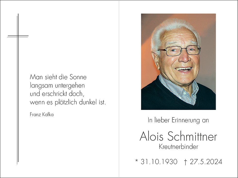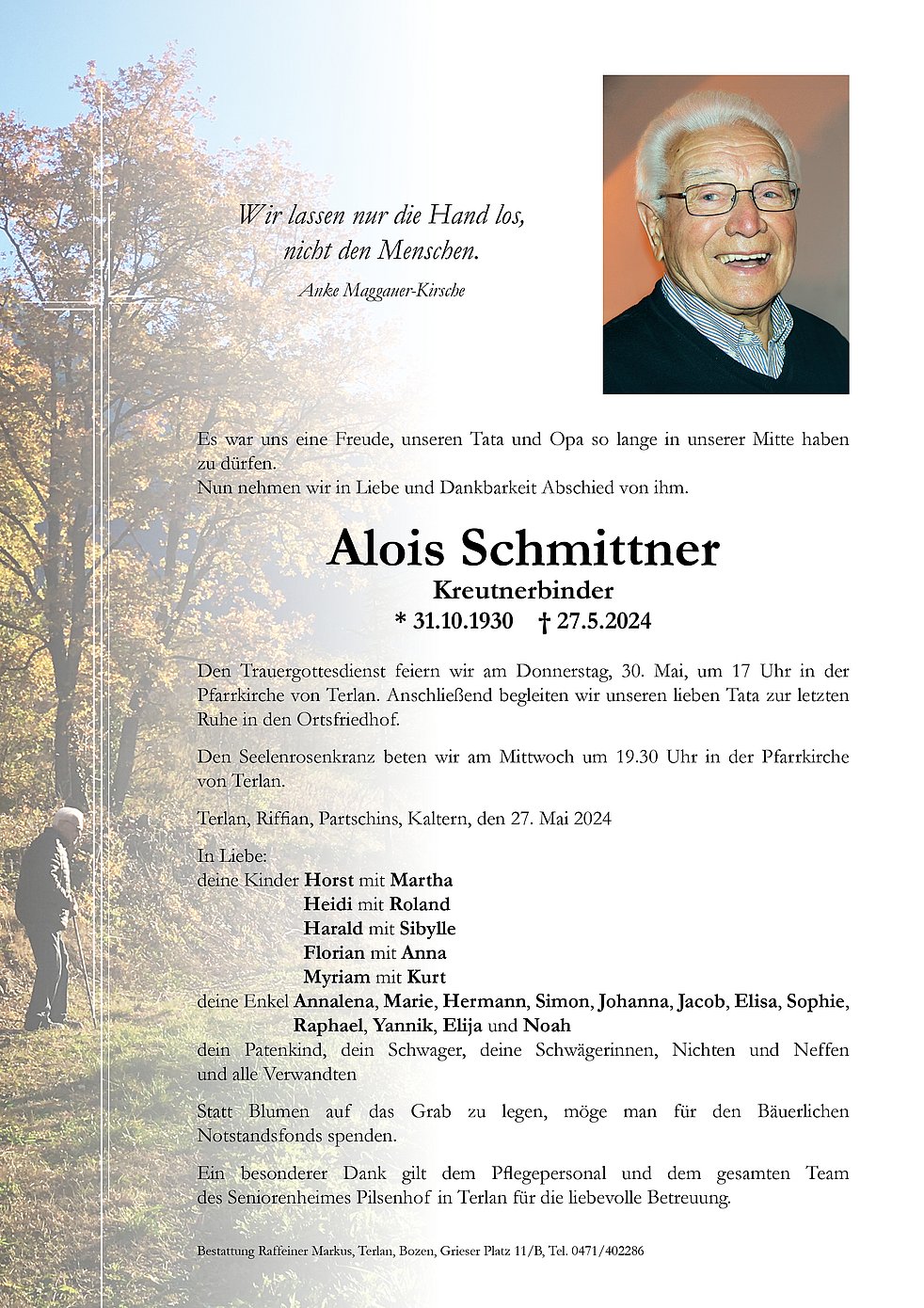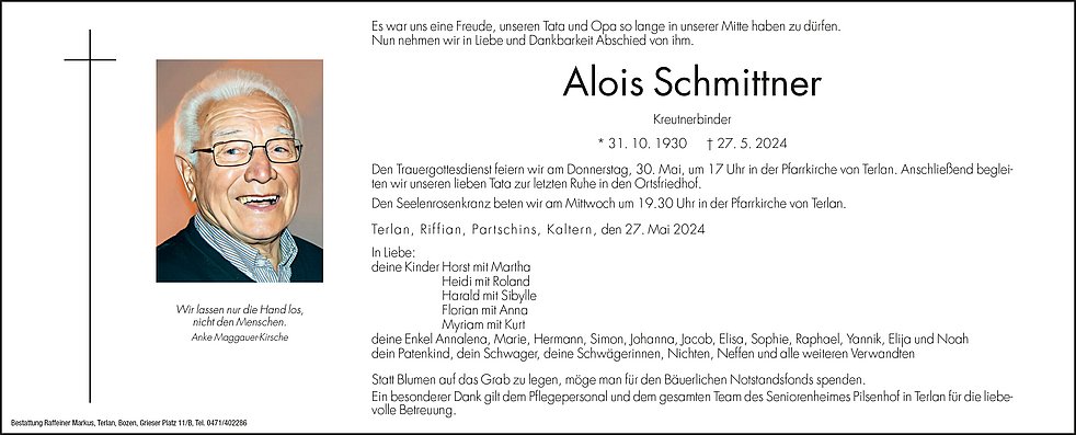 Den Trauergottesdienst feiern wir am Donnerstag, 30. Mai, um 17 Uhr in der Pfarrkirche von Terlan. Anschließend begleiten wir unseren lieben Tata zur letzten Ruhe in den Ortsfriedhof.